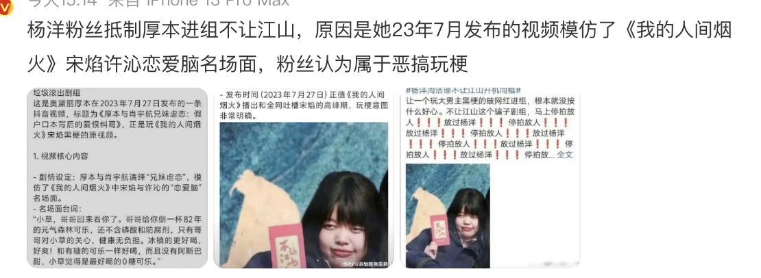 厚本疑似曾经拍视频玩梗杨洋《我的人间烟火》宋焰许沁恋爱脑名场面,现在又和杨洋合作《不让江山》,引起杨洋粉丝极大不满,粉丝在麻辣剧组中。