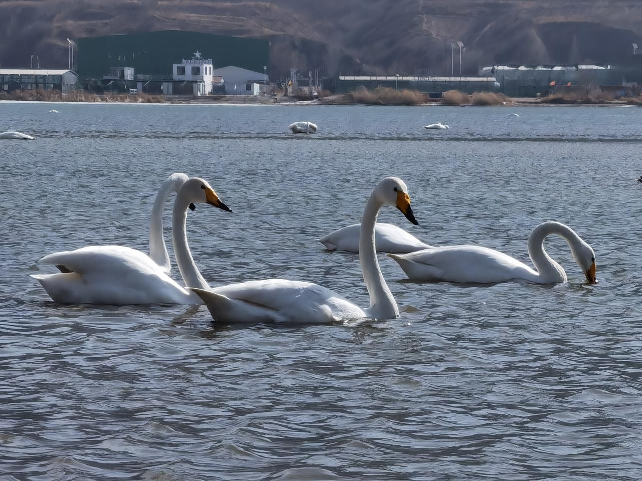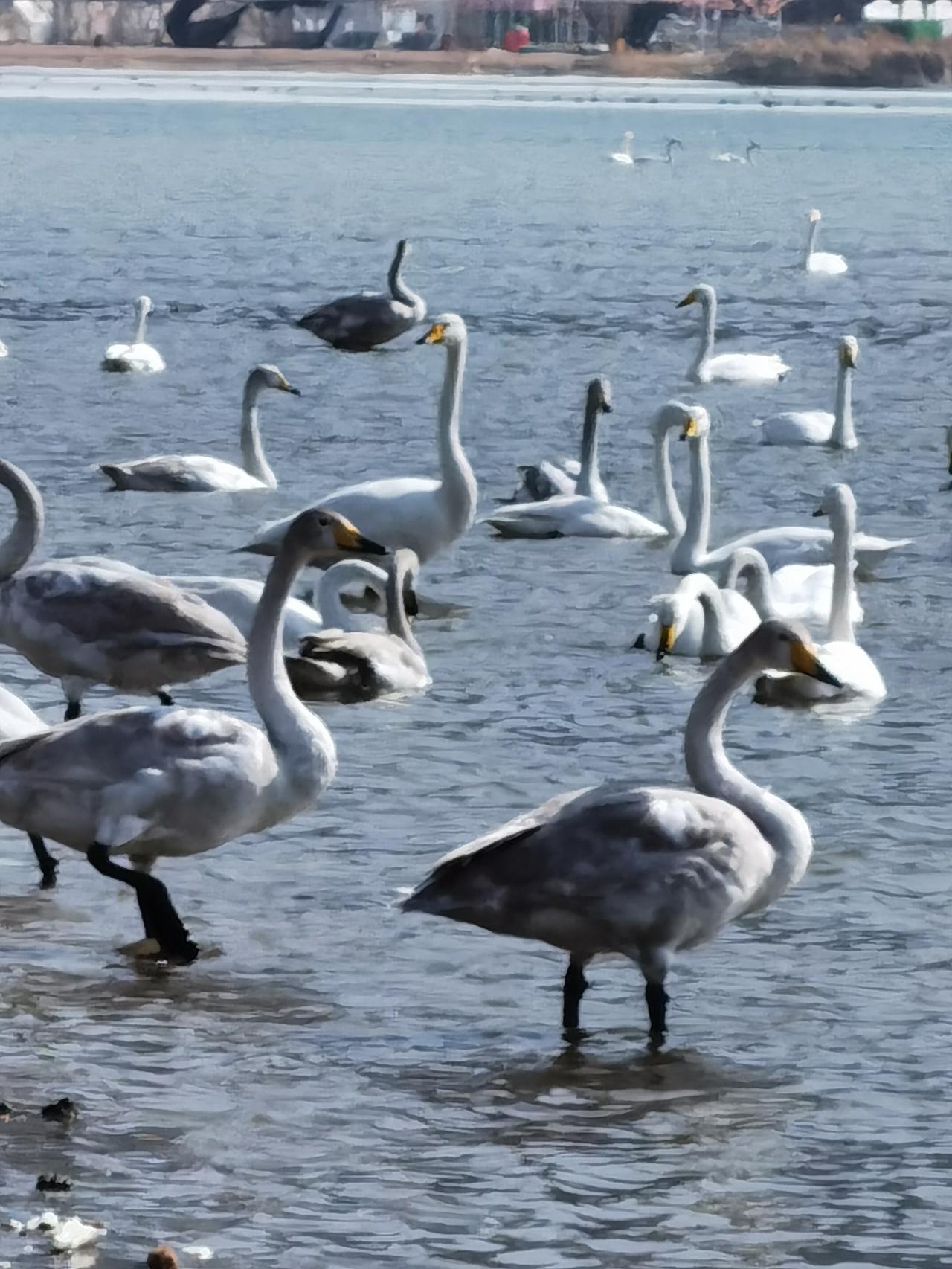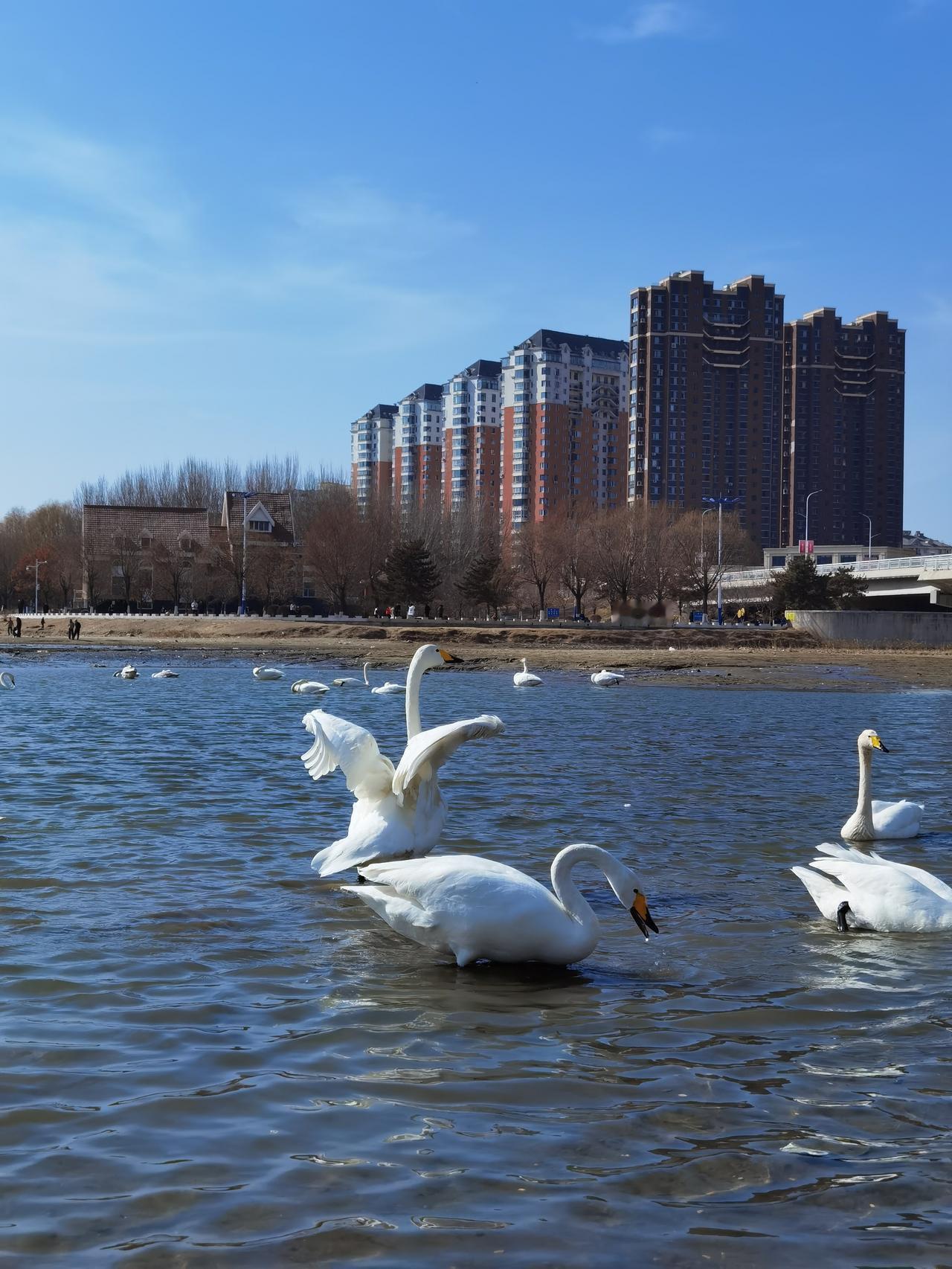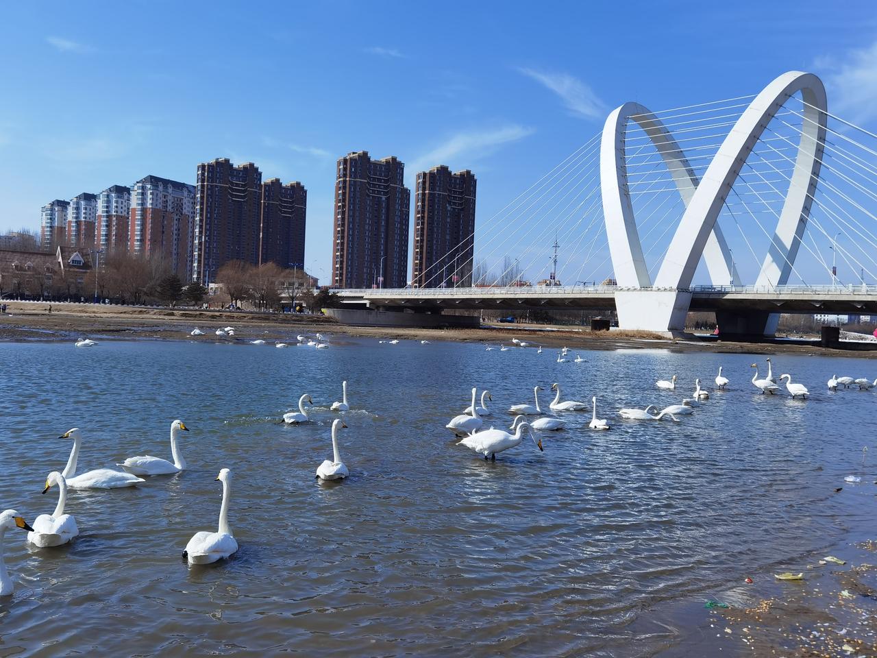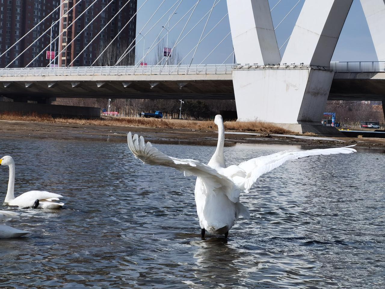 辽宁朝阳真是个好地方,要不为啥天鹅选择栖息在这里呢? 从朝阳博物馆出来不远,大凌河边就可以欣赏到大群天鹅。对于一个外地人,感觉在城市里看到天鹅群 ,是件不可思议的事情。上百只天鹅就在河边自由活动,尽管河边聚集了大量观赏天鹅的游客,但丝毫不影响天鹅的“闲庭信步”,人和天鹅的和谐共处,真是新年里一副美丽的画面。