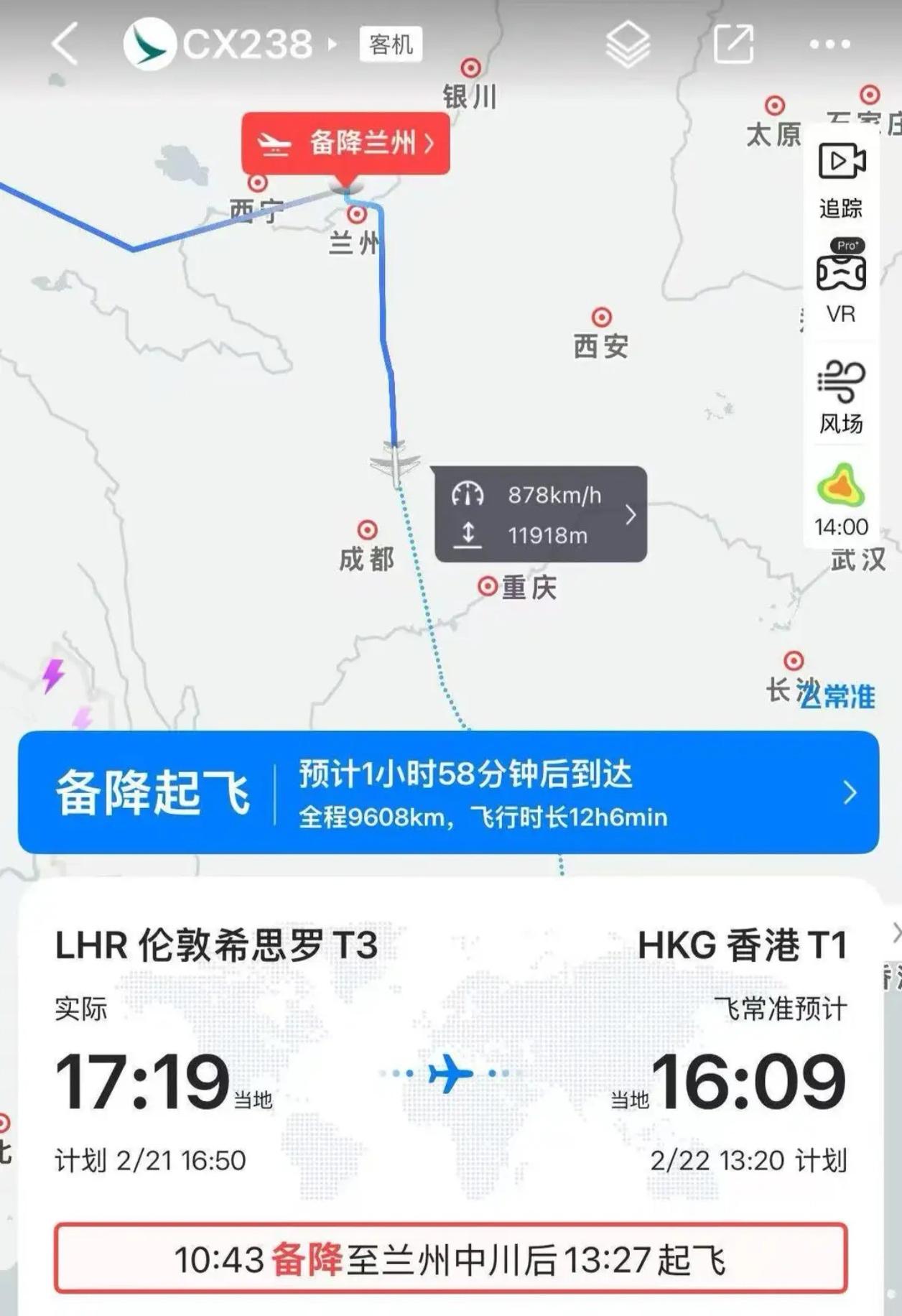 突发!国泰航空伦敦飞香港航班紧急备降兰州,原因曝光 2月22日,一架从伦敦飞往香港的国泰航空CX238航班在飞行途中突发意外,紧急备降至兰州中川机场。这一突发状况迅速引发网友关注。 事件详情 据航旅纵横App显示,该航班原计划于2月22日12时44分抵达香港,但在飞行途中于10时43分备降兰州。对此,国泰航空官方回应称,航班备降原因为机上一名乘客突发身体不适。机组人员按照既定安全程序,决定改道备降兰州中川机场,安排该名乘客下机接受医疗处理。 后续进展 在完成加油及乘客下机程序后,该航班已于13时27分从兰州中川机场再次起飞,继续飞往香港。国泰航空方面表示,乘客及机组人员的安全始终是公司的首要考虑,并感谢受影响旅客的理解与配合。 网友热议 有网友表示,虽然备降导致行程延误,但生命至上,为机组人员的专业处置点赞。也有网友关心,长途飞行中突发身体不适,提醒大家出行前务必关注自身健康状况。 温馨提示 长途飞行对身体消耗较大,建议旅客出行前充分休息,如有基础疾病或特殊需求,可提前与航司沟通,确保旅途安全。