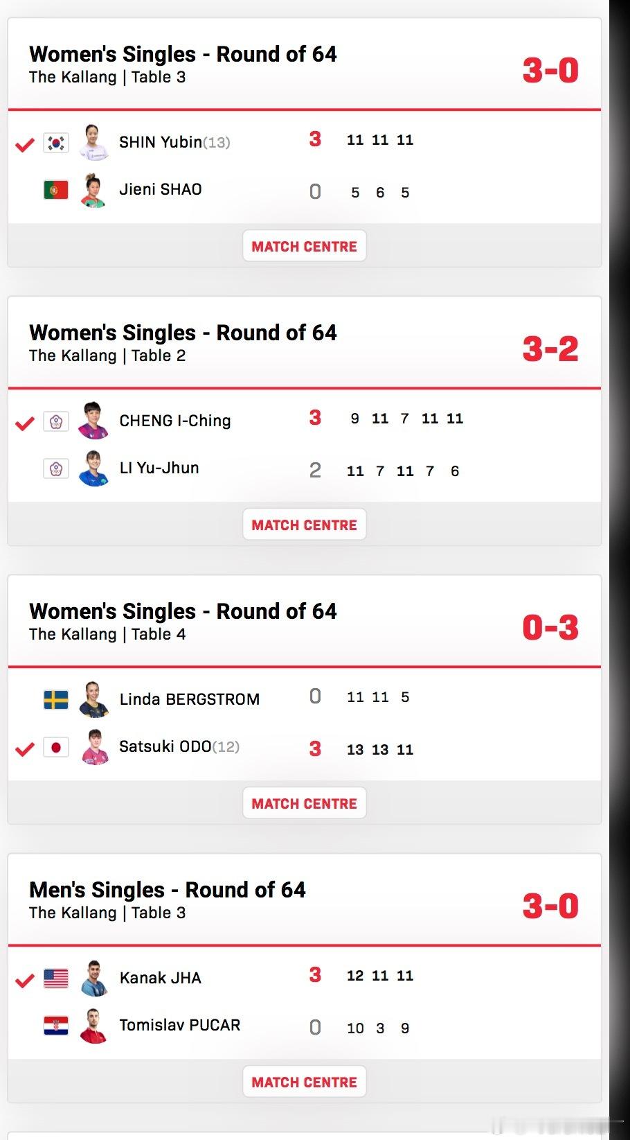 2026新加坡大满贯男女子单打64-32申裕斌3-0邵杰妮郑怡静3-2李昱谆大藤