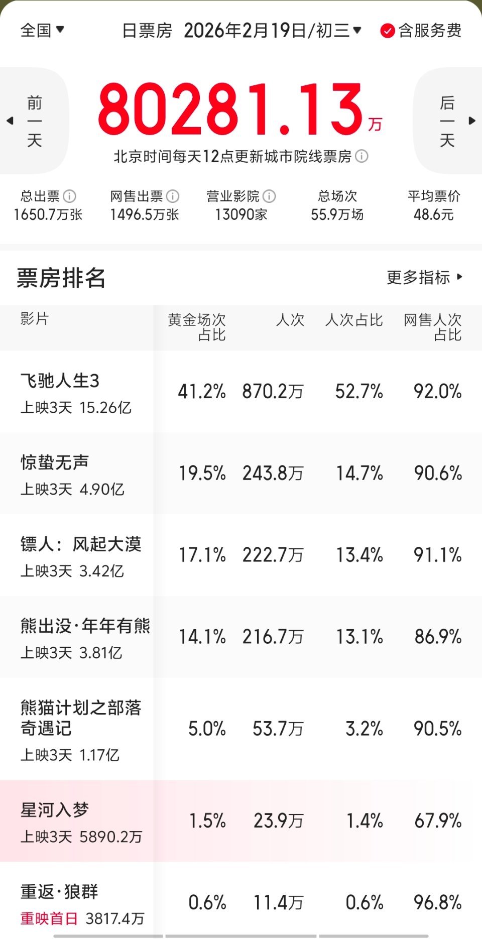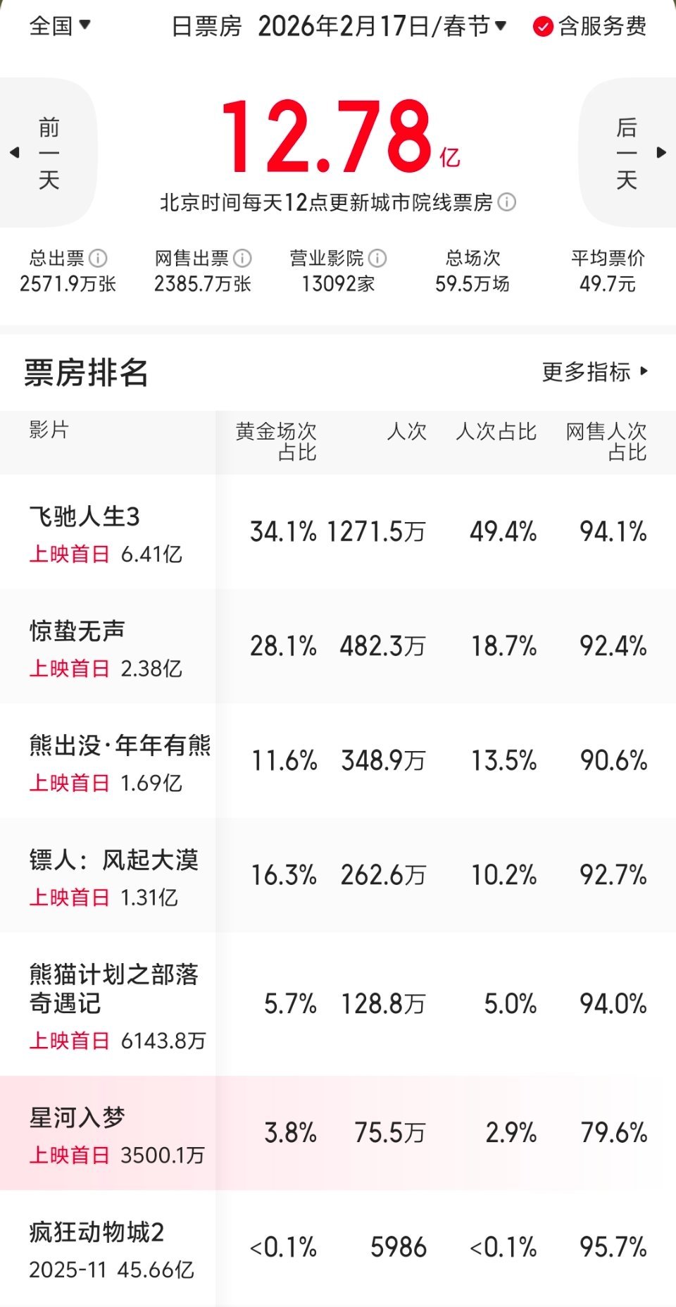 星河入梦上映6天票房仅破7000万这7000万也不是实打实的,前三天的网售比在春节档电影里是最低的,甚至低到60%多,和其它电影形成鲜明对比。