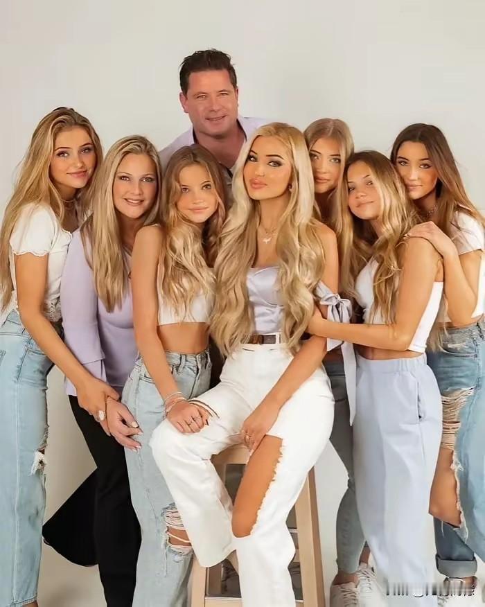 这漂亮的七个女孩,简直就是七个仙女,金发碧眼,异常的迷人,和他们站在一起的这个男子,不知道和她们是什么样的关系,看他年龄,感觉和这些女孩不像是同龄人,他的年龄应该比这些女孩要大一些,看到最后突然才醒悟,也许这七个女孩当中,一个是母亲,六个是女儿,只不过这个母亲也太年轻了,这个男子也许是其中六个女孩的父亲,这么说就说通了!