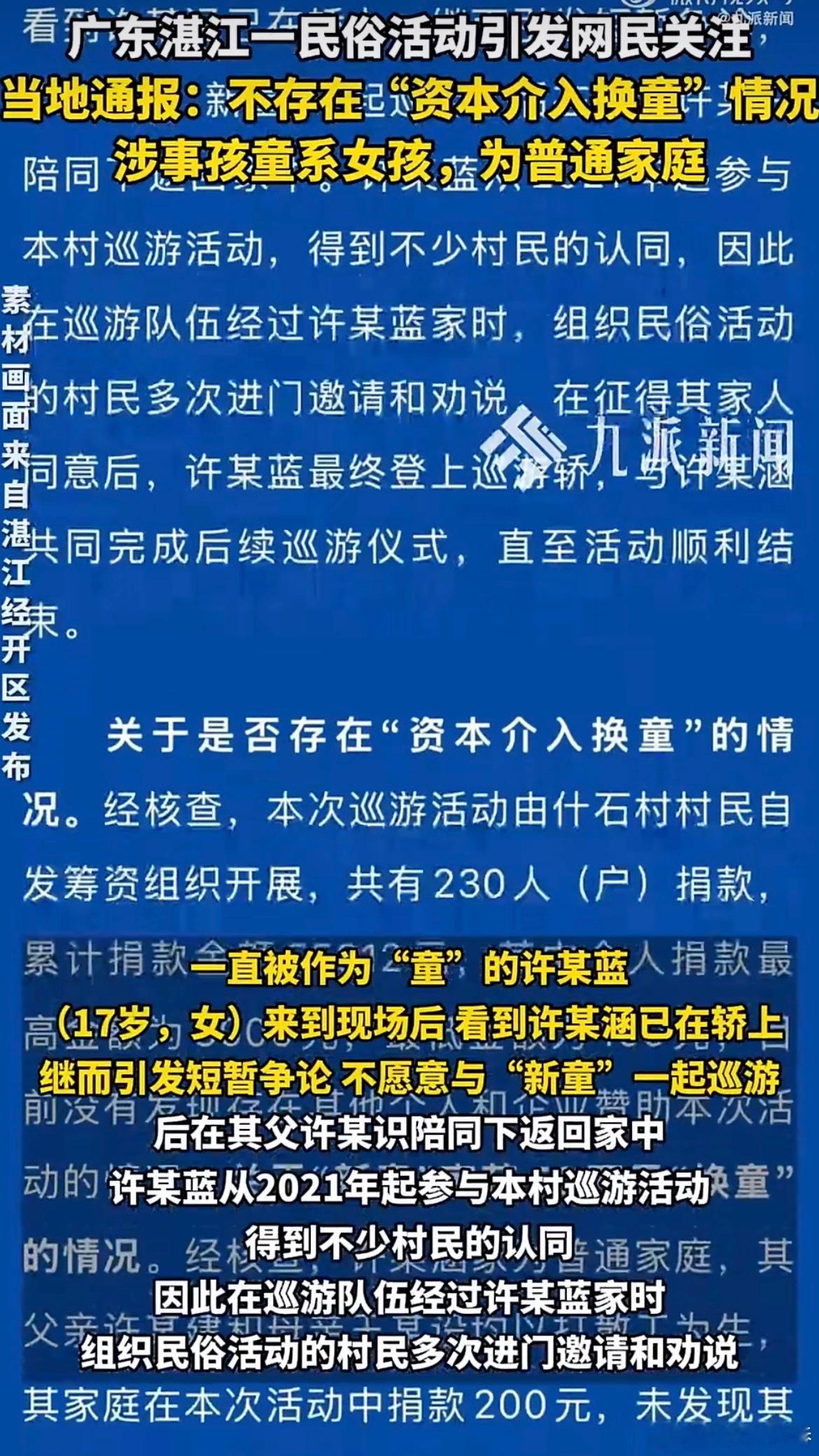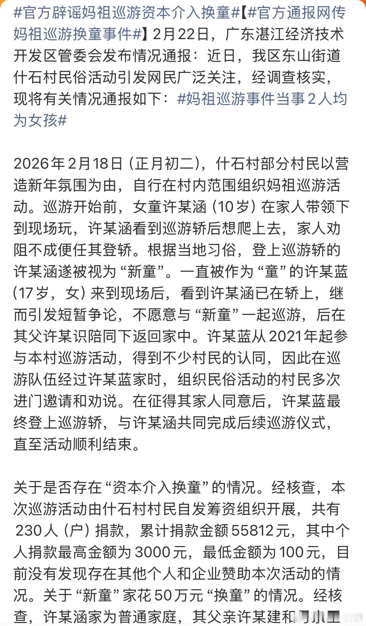 官方通报网传妈祖巡游换童事件妈祖巡游事件当事2人均为女孩广东湛江经开区通报,网传“妈祖巡游换童”事件中当事2人均为女孩,不存在“资本介入换童”及“50万换童”情况。活动由村民自发筹资,230户共捐55812元,无企业赞助。涉事10岁女童许某涵自行登轿被视为“新童”,17岁许某蓝起初因不愿同游返家,后经劝说同意共同完成巡游。