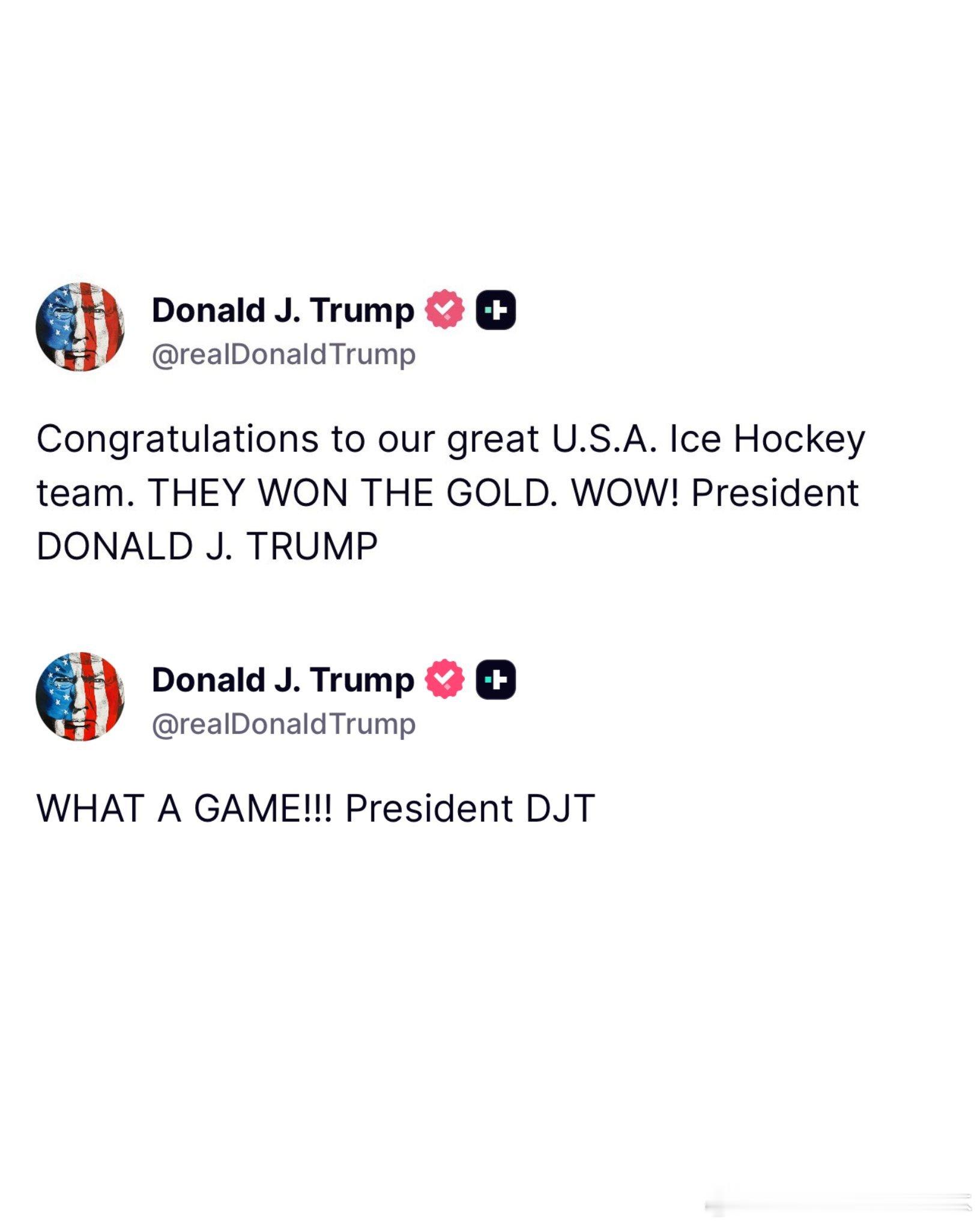 “祝贺我们伟大的美国冰球队!他们赢得了金牌!太棒了!”