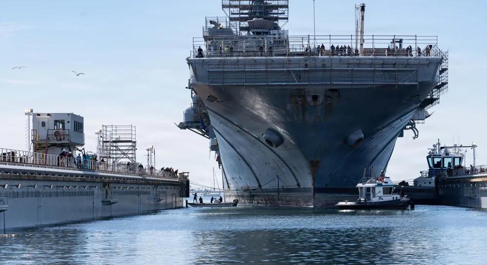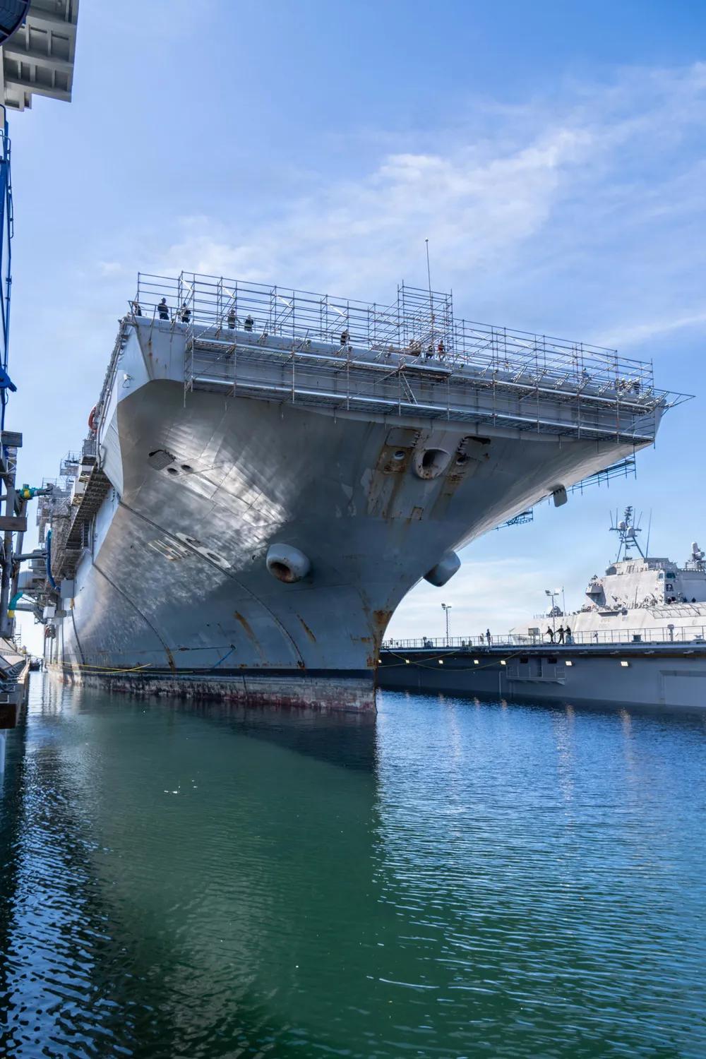 2026年2月21日,圣地亚哥,两栖攻击舰美国号(LHA 6)抵达通用动力国家钢铁与造船公司(NASSCO)干船坞。美国号进入干船坞,支持定期的现代化和维修维护期。