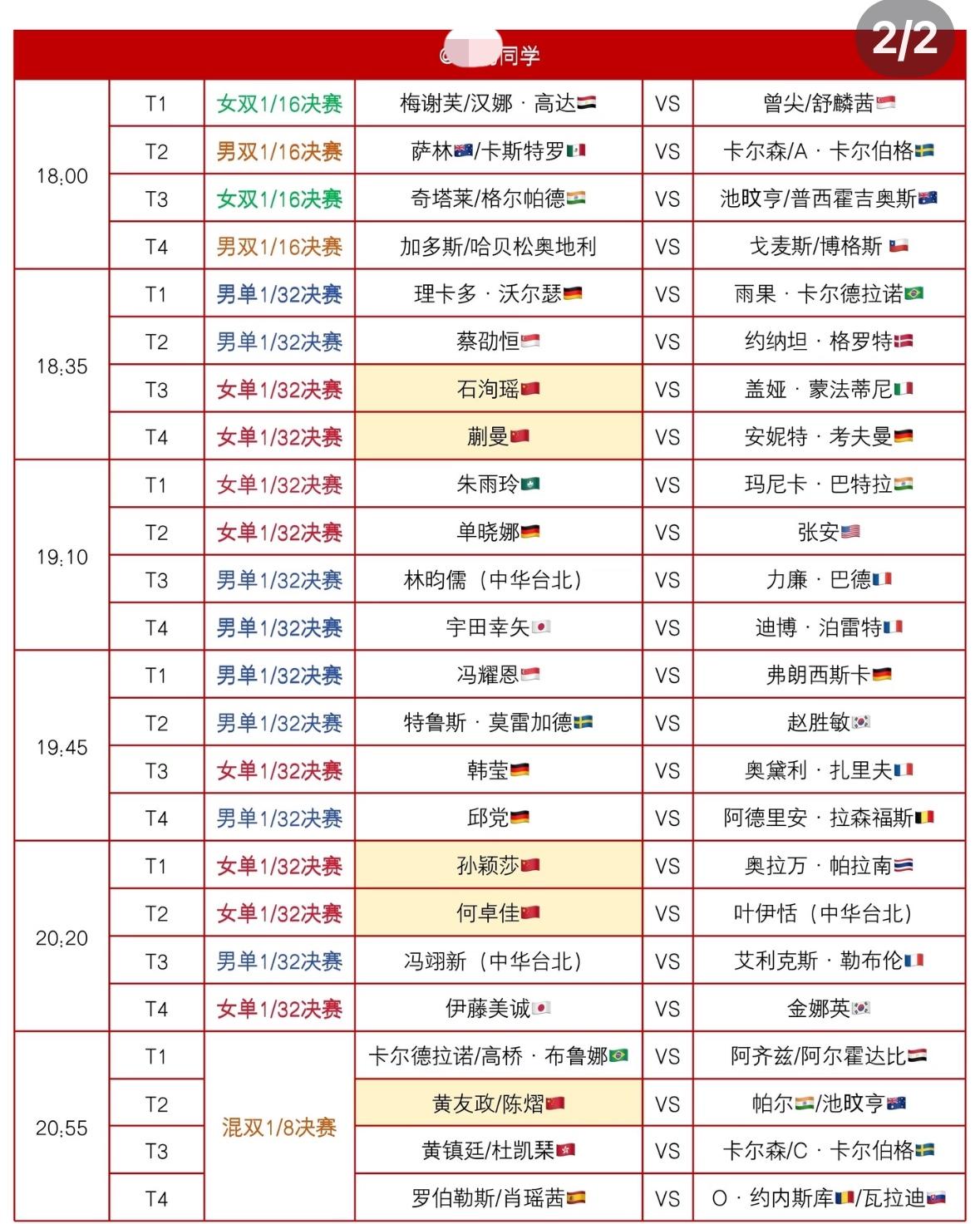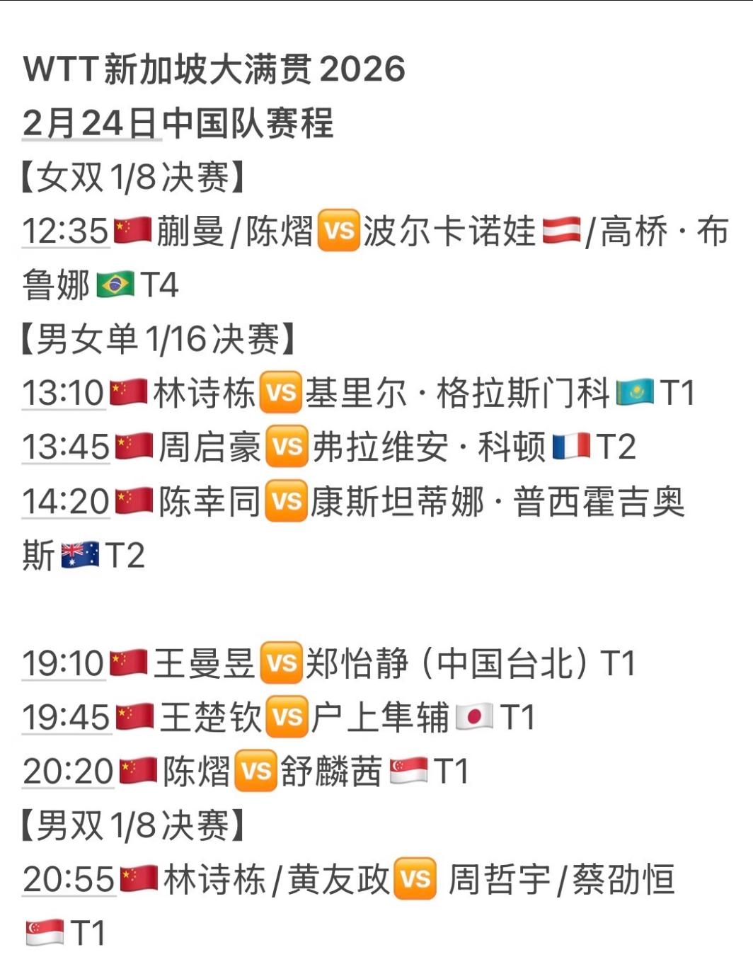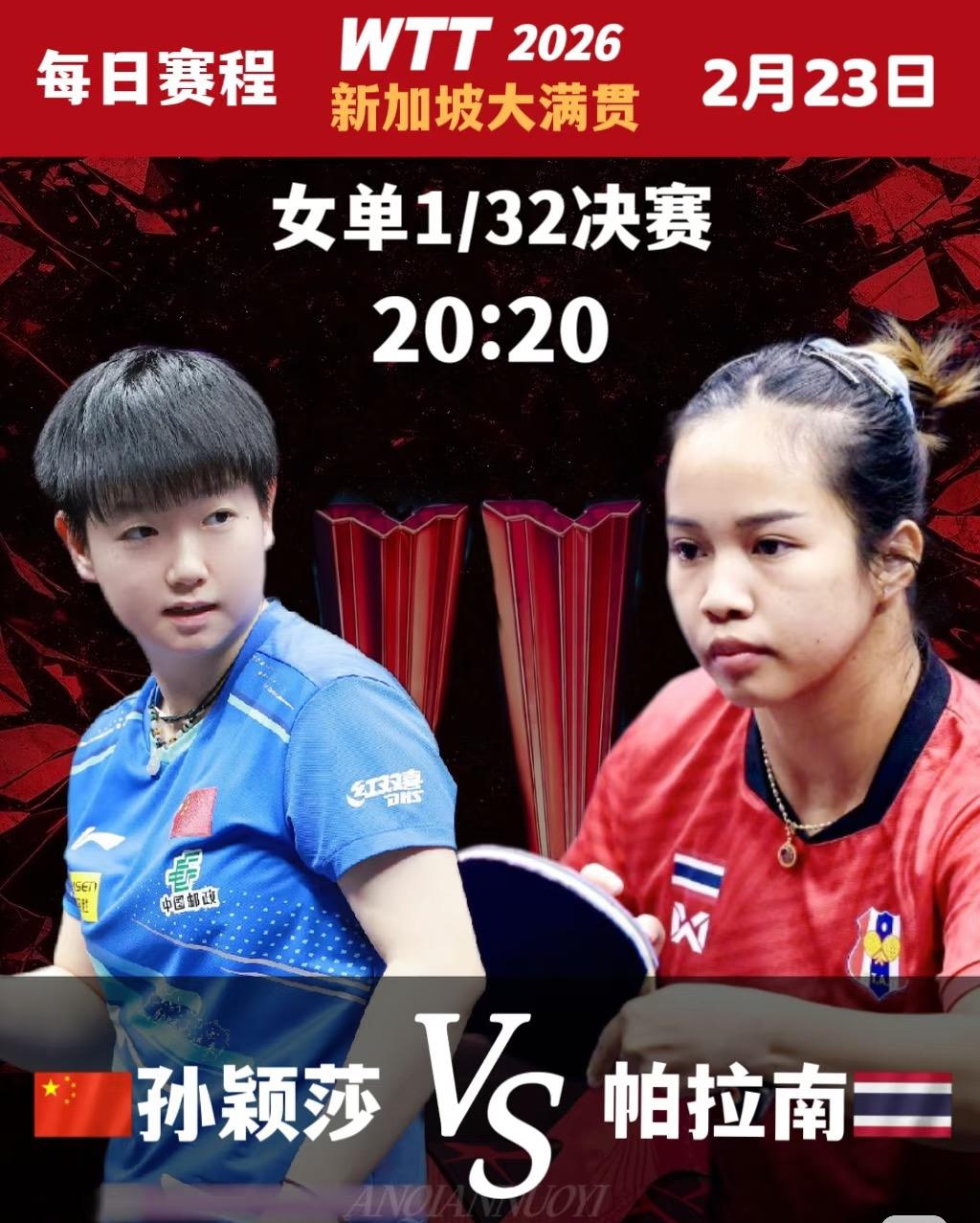 新加坡大满贯2月23日—2月24日赛程 孙颖莎VS帕拉南 陈俊菘VS张本智和! 2月23日孙颖莎将迎来新加坡大满贯 开赛首秀, 女单1/32决赛, 孙颖莎VS帕拉南, 莎莎与帕拉南在23年亚运会打过, 当时莎莎是4:0帕拉南, 今天孙颖莎晚上20:20出场, 帕拉南一路从资格赛杀出来, 正赛首轮遇孙颖莎, 估计帕拉南心里的感觉也很复杂, 有失误也有期待吧! 今天的重点赛程还有 王艺迪VS朱芊曦, 朱芊曦最近状态爆燃, 大迪并不好打,给迪哥加油! 黄友政VS塔卡,也有难度, 塔卡打球很贼,变幻莫测, 黄友政一定做足准备…… 陈俊菘VS张本智和, 也是焦点大战, 希望陈俊菘延续北京大满贯的 好运气和好状态, 一鼓作气,拿下张本智和, 很难打,但小将陈俊菘要 专注到每一分,拼就完了! 14:20,陈垣宇VS达科, 图图加油!