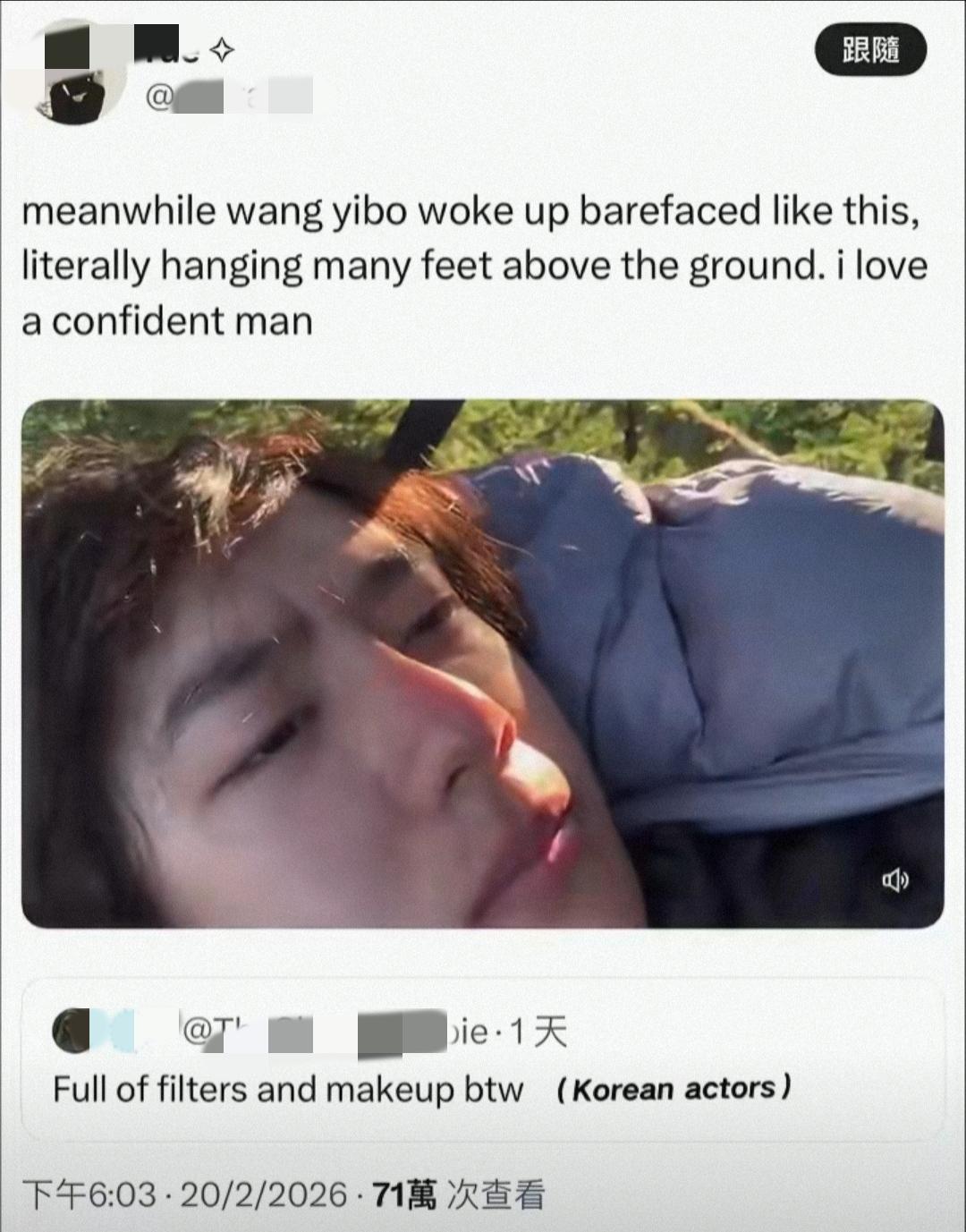 真实往往最能打动人心。 王一博在《探索新境2》中的素颜视频在外网又破万赞了,且已超71万观看! 野外睡在大树上一整晚以后醒来第一时间的纯素颜……王一博就是“素颜的神”,不接受反驳[大金牙]。
