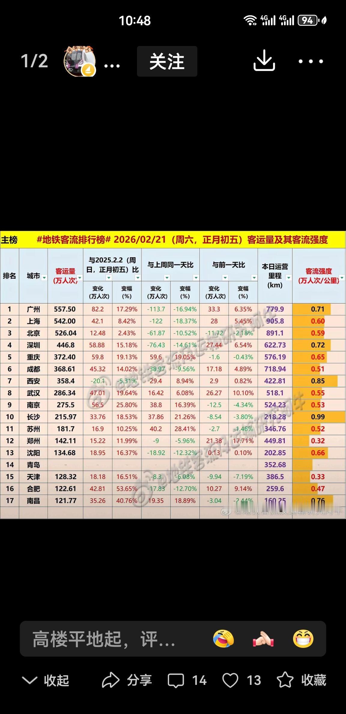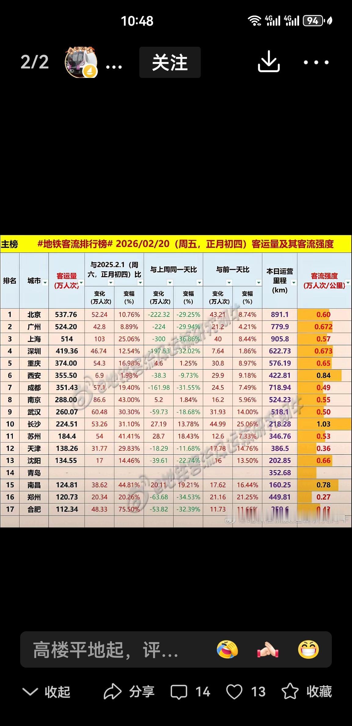 快讯!今年正月初四、五,西安地铁客流强度稳居全国第一,超越了北上广深、成都重庆,由此说明春节期间西安旅游持续火爆,游客对西安旅游热度不减,让我们祝福西安!祝福西安旅游越来越好!同时,从另一个角度来看,西安经济社会快速发展的对地铁建设的需求更加迫切,强烈建议西安继续加大地铁建设的力度,加快地铁四期规划报批步伐,让西安市民和国内国际游客尽早享受到高质量发展的成果。