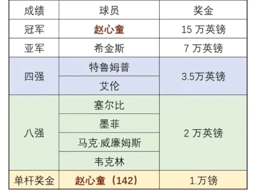 为什么人们会记住冠军? 看看球员锦标赛奖金就知道了! 赵心童夺冠加上单杆最高奖,收入十六万英镑! 亚军希金斯收入七万英镑,连他一半都不到! 四强小特,艾伦收入三点五万英镑,不到四分之一! 八强塞大师,墨菲,马叔,韦克林只有两万英镑,差距就更大了! 人们记住的不是冠军是谁,而是冠军的奖金!这样说你就明白了,如果问近十年的世锦赛冠军都是谁,你一定答不上来!要是问奖金多少,你肯定第一时间说:五十万英镑,不是税后,是税前!