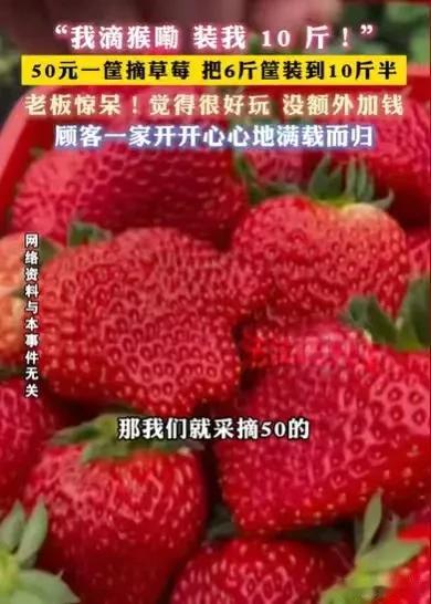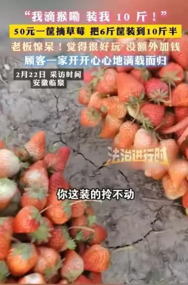 安徽临泉,夫妻俩得知草莓园,50元可以摘一篮子草莓,夫妻俩就带着3个孩子去,孩子们摘了很多,夫妻俩就想方设法,将草莓装进筐里,最后堆了一个大大的草莓塔,原本最多能装6斤的小篮子,最后装了10斤半,夫妻俩对视一笑:这太划算了。 春节了,夫妻俩看着家里的3个孩子,他们就想让孩子们开开心心地度过春节,给童年留下美好的回忆。 他们就想带孩子们到处转转,玩一玩,正在他们考虑去哪里玩时,有人说,附近的草莓园,搞活动,50元可以摘一大筐。 夫妻俩一听就来了兴趣,他们孩子多,摘草莓,正适合他们,他们可以一边摘草莓,享受摘草莓的乐趣,还可以趁着这个活动,多摘一些草莓,囤起来,让孩子们拿回家吃个够。 孩子们一看爸爸妈妈带他们去摘草莓,他们欢呼雀跃,一起高高兴兴就要去摘草莓。 去摘草莓的路上,一家人就七嘴八舌地商量着,谁负责摘草莓,谁负责装草莓,将小篮子装得满满的,这样就划算了。 一家人高高兴兴地商量着,计划着,如何将小篮子装得满满的,他们越说越兴奋,很快就来到了草莓园。 孩子们一来到这里,撒开腿,就奔跑进了田间,开始摘草莓了。 夫妻俩看着有人把小篮子装得满满的,他们也做好了打算,等孩子们摘草莓回来,他们也要把小篮子装得满满的。 反正一篮子50元,能装多少是自己的本事,装多装少都是50元,为何不多装一点。 趁着孩子们去摘草莓,夫妻俩看了一下旁边的人,怎么装草莓,看到有一些人装草莓,装得稳稳的,他们就吸取了一些装草莓的经验。 终于轮到他们装草莓了,孩子们已经摘了不少草莓回来了。 夫妻开始动手装草莓,他们只有一个目标,那就是能装多少就装多少,孩子们负责摘,他们负责装。 为了将草莓装得多多的,夫妻俩绞尽脑汁,一起商量,怎么装草莓才能装得更多。 他们一会儿像孩子们叠积木一样装草莓,一会儿又想着让草莓的茎缠在一起,叠起来。 他们一边想办法,一边堆草莓,堆着堆着,他们就堆出经验来了。 他们明白,要将草莓装得更多,一定要采用叠积木的方式,平衡草莓,同时草莓的茎也要用上,他们越叠越有经验,越叠越多。 孩子们开开心心地摘了很多的草莓,又兴奋地看着父母堆草莓塔。 他们看着小篮子里的草莓越堆越多,越堆越高,他们都兴奋了,在爸爸妈妈身边团团转,激动得手舞足蹈的。 父母没有令他们失望,他们最后堆了一个大大的草莓塔,又高又圆,比别人装的草莓都要多很多,甚至比有的人装的草莓多了一半。 直到他们再也无法把草莓装进篮子里,他们这才罢休。 不过他们装好草莓之后,篮子都拎不动了,只好请老板过来。 老板过来一看也是震惊了,那小小的一个篮子,居然装了大大的一篮草莓,真不知道这两夫妻是用什么方法将草莓装起来的,反正那一篮子草莓,老板还真没有见过有人装这么满的。 他惊叹道:“这一篮子50元,你们都装得拎不动了!” 他把草莓称了一下,装了10斤半,老板看着那一篮子草莓,叹了一口气。 50元,就装了他10斤半的草莓,实在太多了。 但是他没有多收钱,毕竟的活动规定的就是50元一篮子,至于怎么装是顾客的事情。 正常情况下,他的一篮子能够装的草莓,最多是6斤多一点,现在这一家人一下子装了10斤半,实在令人震惊。 不过老板说,他只是觉得好玩而已,他们一家人居然能装这么多草莓,实在让他感到有些好笑。 别人想尽办法,只能装6斤多的小篮子,这一家人竟然能够装10斤多,实在是有天赋。 最后他看着这一家人高高兴兴地回家,也只能无奈地摇了摇头,他感到可笑又好玩。 其实老板推出这个活动,已经约定好一篮子能装多少就是多少,那么夫妻俩带着孩子来摘草莓,他们这一篮子草莓装多少也是他们的本事,他们只需付50元,这是约定,他们已经构成合同关系了。 《民法典》第509条规定:当事人应当按照约定全面履行自己的义务;当事人应当遵循诚信原则,根据合同的性质、目的和交易习惯履行通知、协助、保密等义务。 最后老板也是让夫妻俩付了50元,就让他们将那10斤半的草莓带回家,老板已经履行了自己的义务,夫妻俩也履行了自己的付款义务。 那么你对此事有何看法呢?