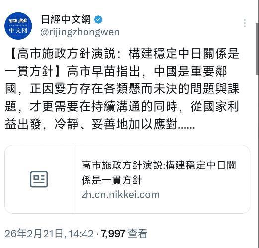 日经新闻中文网今天(2月21日)报道:“【高市施政方针演说:构建稳定中日关系是一贯方针】高市早苗指出,中国是重要邻国,正因双方存在各类悬而未决的问题与课题,才更需要在持续沟通的同时,从国家利益出发,冷静、妥善地加以应对……” 高市早苗在2026年2月21日的施政方针演说中提到,中国是重要邻国,正因双方存在各类悬而未决的问题与课题,才更需要在持续沟通的同时,从国家利益出发,冷静、妥善地加以应对,构建稳定中日关系是一贯方针。这番表述看似传递出对话意愿,但结合其过往言行与日本近期政策动向,不难发现其中的矛盾与模糊性。 高市早苗作为日本右翼政客的核心人物,其对华立场长期呈现强硬倾向。她在2025年11月的国会答辩中就公然声称“台湾有事就是日本有事”,暗示可能行使集体自卫权介入台海问题,这一言论直接违反一个中国原则和中日四个政治文件精神。2026年1月,她再次表态若美军在台海遭受攻击,日本不会坐视不理,这类表述与此次演说中“稳定中日关系”的说法形成明显反差。 日本政府的实际行动更能说明问题。高市早苗连任首相后,新一届内阁延续右翼路线,加速推动修宪进程,试图将自卫队重新定义为“实力组织”,彻底摆脱战后和平宪法的束缚。2026年2月20日的施政方针演说中,她还明确提出要放宽防卫装备品出口规则,计划修订《国家安全保障战略》等安保文件,同时强化与韩国、菲律宾等国的安保合作,这些举措本质上是在加剧地区军事对峙态势。 中方对日本的危险动向始终保持高度警惕并作出明确回应。2026年2月18日高市早苗连任当天,中国常驻联合国代表傅聪就在联合国总部发声,严正指出日本企图借助“集体自卫权”插手台湾问题的行为违背战败国责任,违反《联合国宪章》,任何武力介入台海的举动都将被视为侵略,中方必将坚决反击。中国驻日本大使吴江浩此前也明确表态,中日关系陷入邦交正常化以来最严峻困难的局面,责任完全在日方。 台湾问题作为中国核心利益中的核心,是中日关系不可触碰的红线。高市早苗及其政权屡次在这一问题上进行挑衅,甚至公然鼓吹“台湾地位未定论”,这种行为严重伤害中国人民感情,破坏了中日关系的政治基础。中共中央政治局委员、外交部长王毅在慕尼黑安全会议上就曾严词批评,日本首相战后80年来第一次公开发出这种狂言,暴露了日本侵略殖民台湾的野心未泯、复活军国主义的阴魂不散。 面对日方的两面派做法,中方已采取一系列精准反制措施。2026年1月,中国商务部发布公告,禁止所有两用物项对日本军事用户和用途出口,涵盖高纯度石英砂等日本高度依赖的核心原料。此前中方还实施了赴日旅游预警、暂停进口日本水产品等措施,2025年11月后中国游客赴日人数环比下降21.4%,给日本旅游业带来实质影响。这些措施并非针对日本民众,而是对日本政府错误政策的必要回应。 构建稳定的中日关系确实符合两国人民的根本利益,但这种稳定必须建立在相互尊重、遵守国际法和政治承诺的基础上。高市早苗政权若真有改善中日关系的诚意,就应停止在台湾问题上的操弄,放弃修宪扩军的危险行径,正视历史罪责,恪守中日四个政治文件确定的原则。嘴里喊着对话,手上却忙着对抗的做法,只会进一步消耗中日之间的互信,让两国关系陷入更深的困境。 国际社会也普遍希望中日两国能保持沟通、管控分歧。但这种沟通不能是单方面的利益诉求,更不能以牺牲他国核心利益为代价。日本作为二战战败国,理应珍惜来之不易的和平局面,遵守战后国际秩序,而不是不断突破军事限制,制造地区紧张局势。只有日方切实拿出诚意,用实际行动纠正错误,中日关系才有可能回到健康稳定发展的轨道,这是对两国人民负责,也是对地区和平稳定的贡献。
