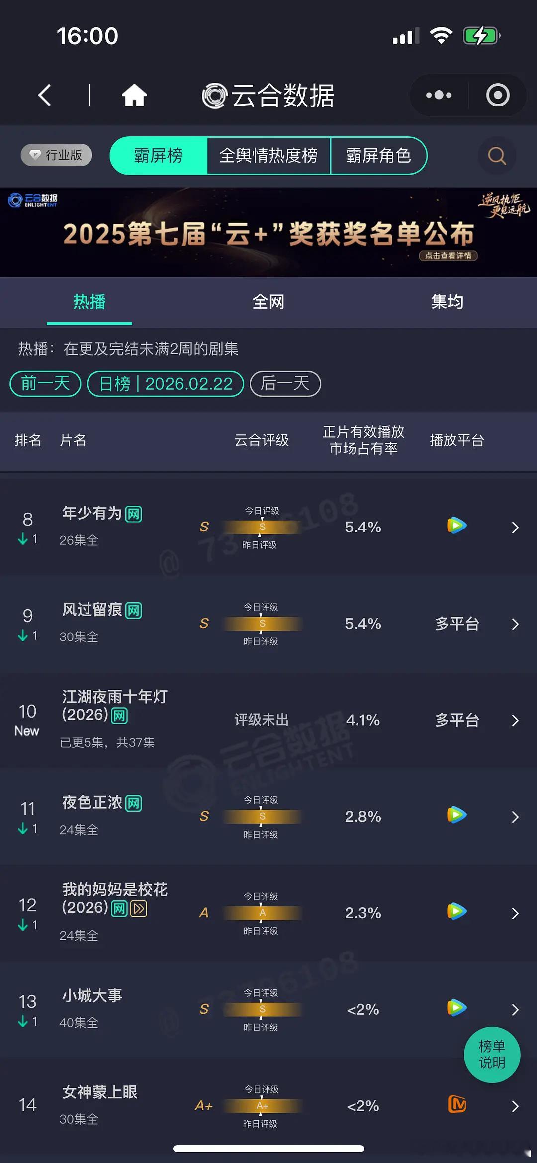 2.22 云合 唐宫17% 成何体统13.1% 岁月9.5%江湖夜雨十年灯4.1%