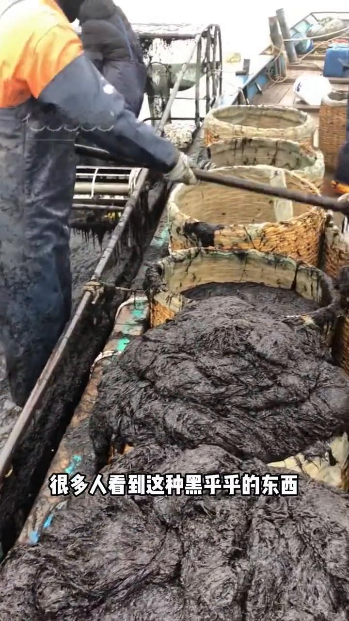 很多人看到这种黑乎乎的东西都会误以为是工人正在清理淤泥,其实这正是我们经常吃的紫菜。不少人会觉得很恶心,但这恰恰是紫菜最原始的样子。 人工培育的紫菜附着在网帘上生长,成熟后再由采收船从网帘上刮下来。刚收割的紫菜水分足,堆在一起又黑又粘,样子很难和食物联系起来。这些黑泥运回工厂后经过清洗、除杂、脱水、烘干、压制成型后,最终就成为了我们日常吃的干爽紫菜了。