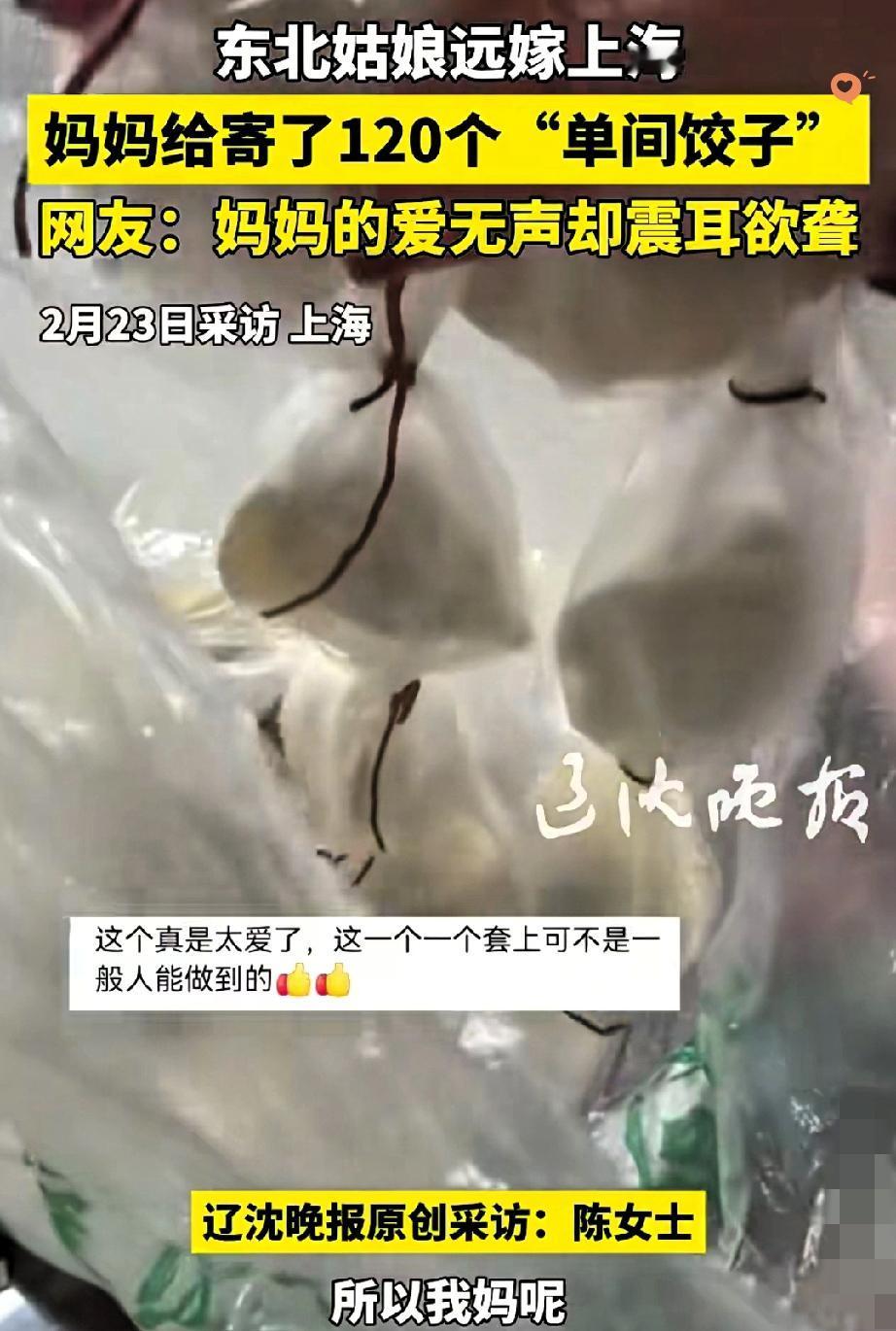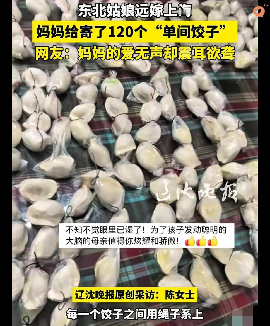 东北妈妈给远嫁上海的女儿寄120个“单间饺子”,看完直接泪目! 东北姑娘远嫁上海,今年没能回娘家过年。妈妈怕千里之外的饺子坨在一起、变味变形,竟然四个一袋,中间还细心用绳子系好,给每个饺子都安排上了“单间”。 120个饺子,不知道妈妈包了多久、分装了多久,每一袋都藏着说不出口的牵挂。 没有华丽的语言,却用最笨拙、最细致的方式,把爱打包寄给女儿。 网友说,妈妈的爱无声,却震耳欲聋。 真的是这样,不管我们长多大、走多远,在妈妈眼里,永远是需要被细心照顾的小孩。 这哪里是饺子,分明是裹着热气腾腾的思念。 你收到过爸妈寄来最暖心的东西是什么?快来评论区说说~