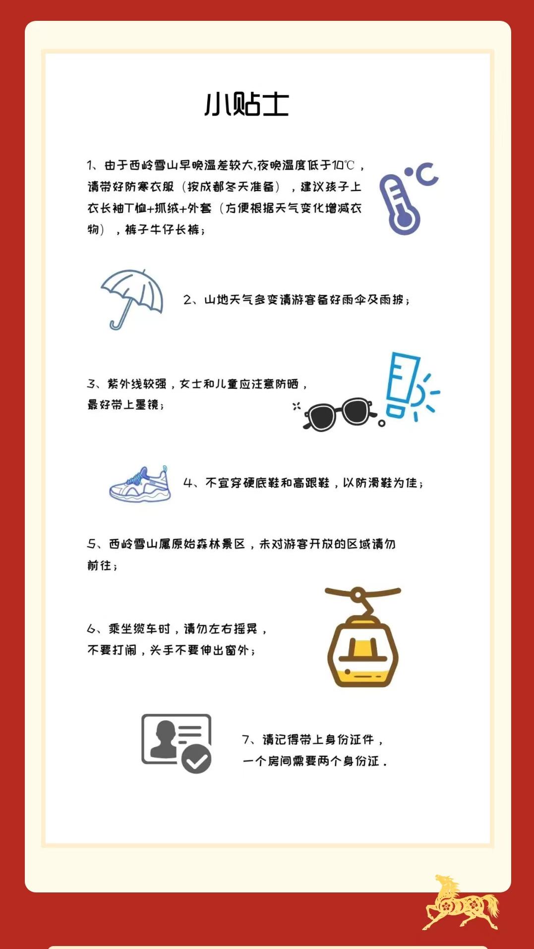 前往景区游玩请做好保暖防护,穿戴防滑鞋具与防风御寒衣物,密切关注最新气象,注意出
