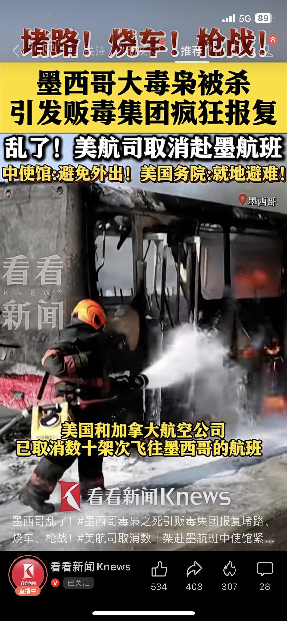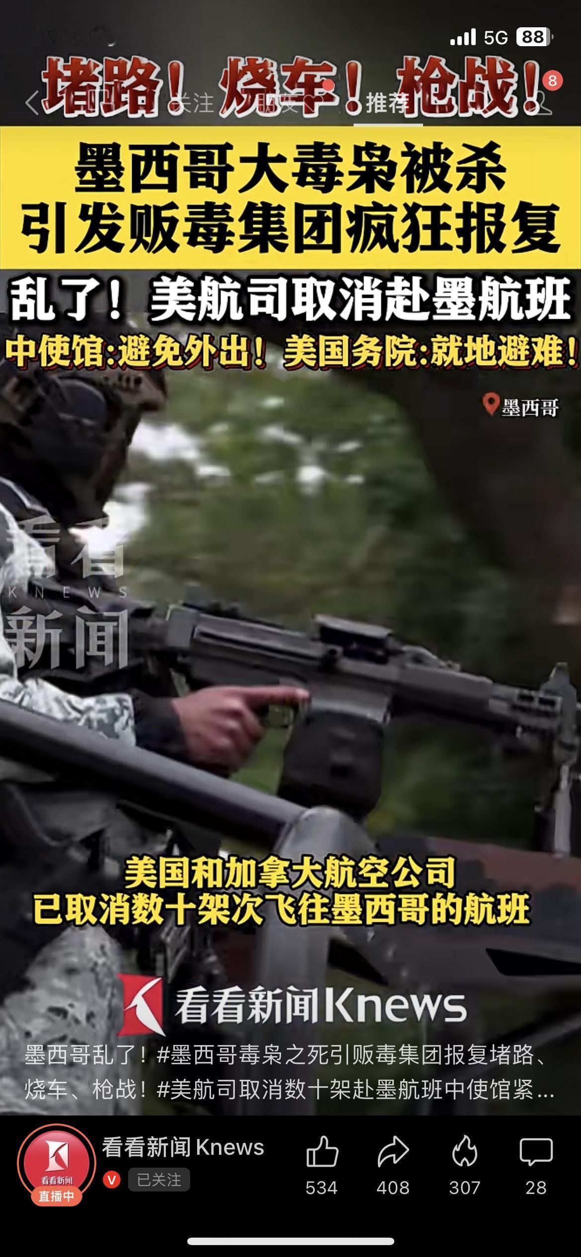 当地时间2月22日,绰号“埃尔门乔”的墨西哥大毒枭在哈利斯科州被击毙,随后贩毒集团发动疯狂报复,多地爆发暴力骚乱:堵路、烧车、枪战,旅游城市巴亚尔塔港甚至发生了武装冲突。 美国和加拿大的航空公司已经取消了数十架次飞往墨西哥的航班,中国驻墨西哥使馆提醒公民避免外出,美国国务院也建议公民就地避难。 我有个朋友本来计划下个月去墨西哥旅游,看到新闻后直接把机票退了,说小命要紧。 真的太乱了,希望在那边的同胞都能平平安安。 墨西哥 毒枭 枪战 旅游安全