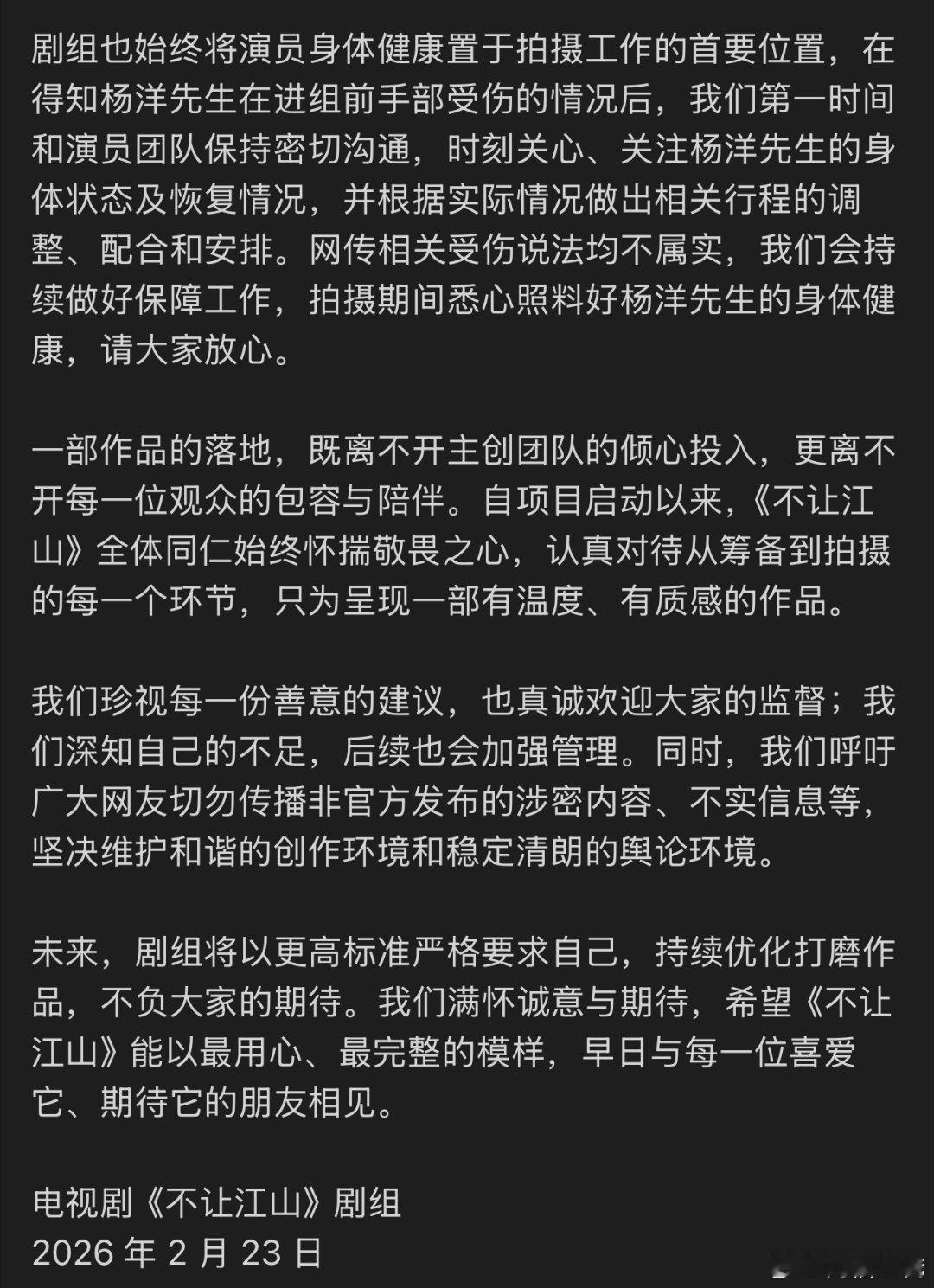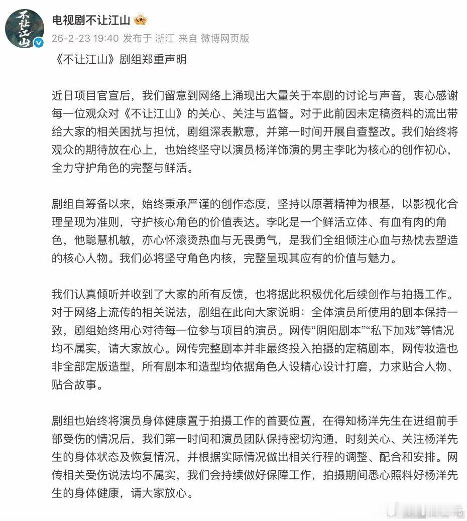 不让江山剧组发布声明 刚看到《不让江山》剧组的声明,感觉没有敷衍回应,而是真的把这几天大家吵得最凶的几个点——剧本造型泄露、演员受伤都挨个做了说明。明确了杨洋是绝对剧集核心、改编尊重原著、泄露版剧本非最终版。至少这解决问题的态度是摆出来了,给粉丝吃了颗定心丸。接下来就看剧组能不能说到做到了,希望剧组能好好拍,别辜负这份信任。