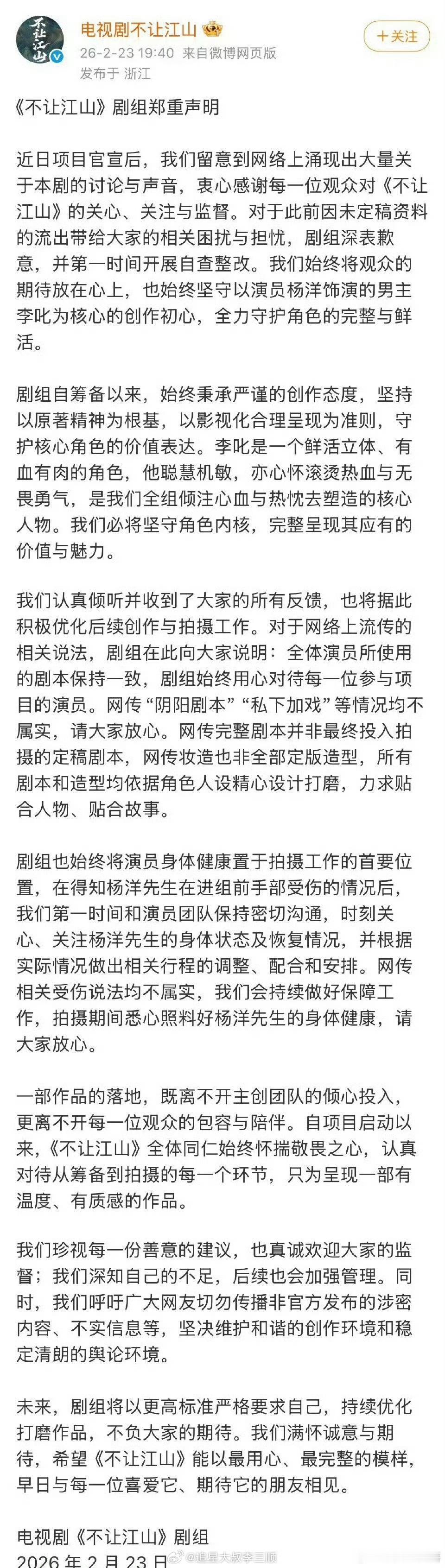 不让江山剧组声明看完官方的长文,我觉得大家可以把心放肚子里了,其实仔细想想都知