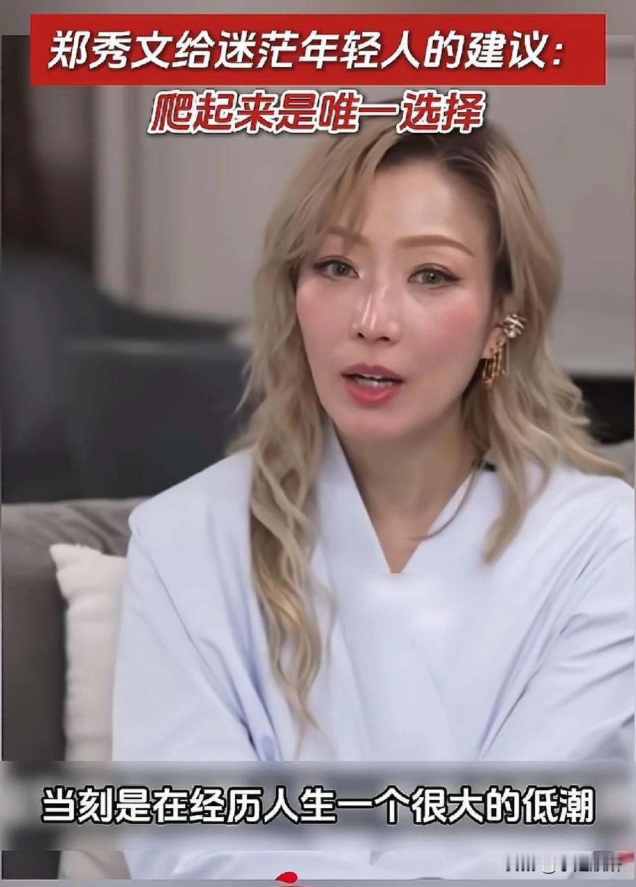 郑秀文说: 当刻是在经历人生一个很大的低潮,你觉得你无力爬起来,我可以话你听,爬起来是人生唯一的选择 因为你没有可能永远都沉沦了,跌倒了。晒图笔记大赛 香港艺人真是好真实,很励志,很爱国的艺人! 每一个人都会跌跌碰碰时候,人往前看,每一次人没有一帆风顺事,所以站起来。郑秀文