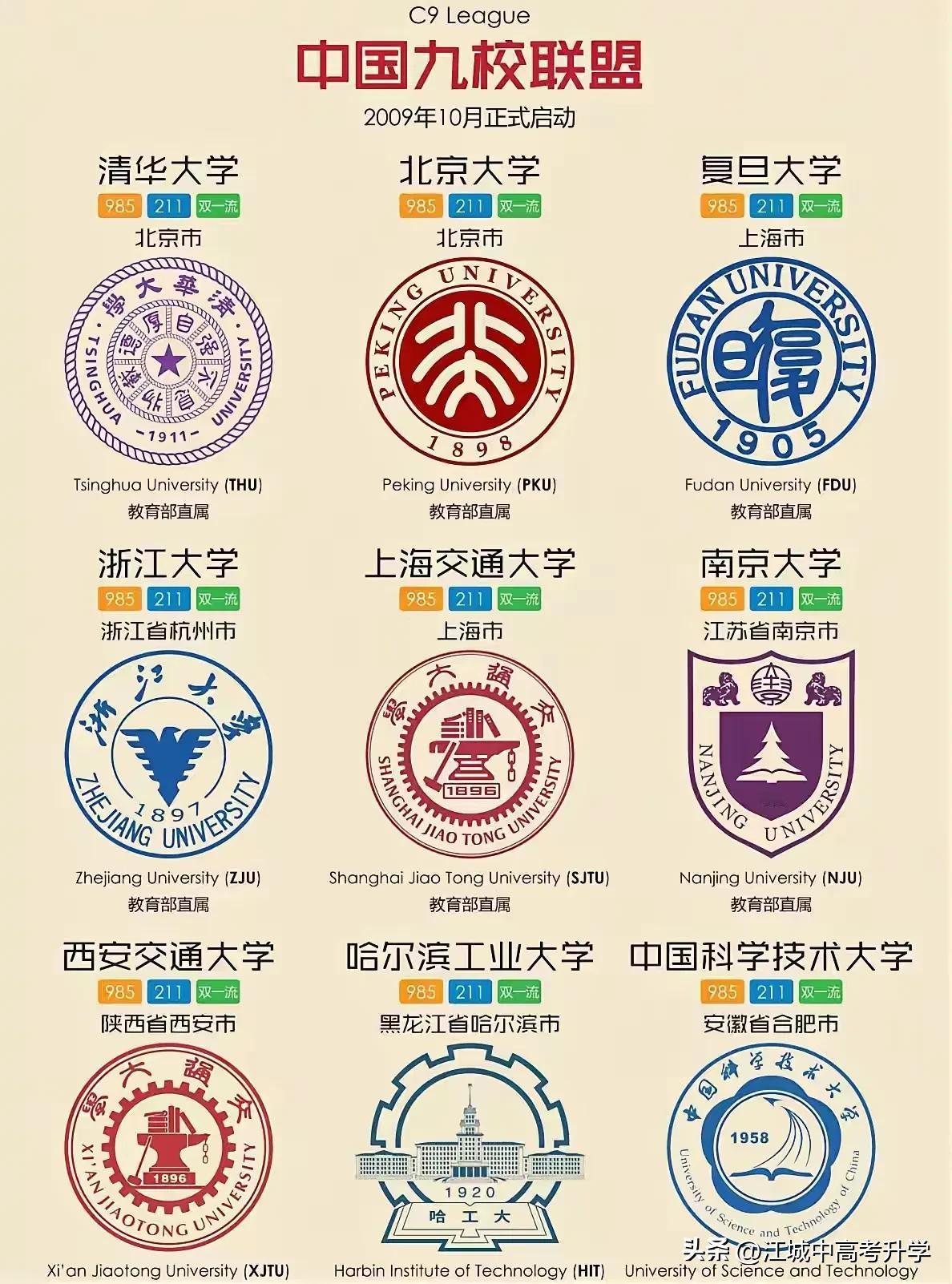 中国顶级985高校C9联盟9所大学, 任意得一可以可谓未来进了保险箱, 也算是给寒窗苦读15年最好的交代。 2009年10月,9所国内最顶尖的高校正式抱团,组成了中国版“常春藤联盟”:清华、北大、复旦、上交、浙大、南大、西交、哈工大、中科大。 这9所高校,随便拎出一个都是响当当的存在,凑在一起更是直接承包了国内高等教育的半壁江山! 💡 学霸天团的“硬核实力”,到底有多牛? 说出来你可能不信,C9高校的科研实力,真的是“恐怖如斯”: 科研经费碾压级:单说2025年,清华北大的科研经费都突破了300亿,浙大也紧随其后。这么多钱砸下去,难怪能搞出一个个国之重器! 学科排名霸榜:在最新的学科评估中,C9高校的A+学科占了全国的近40%。清北的基础学科、浙大的农学、哈工大的航天、中科大的物理……每一个都是拿得出手的“王牌”! 人才输出天花板:从C9走出来的毕业生,不是进了顶尖科研院所,就是成了行业大佬。华为、阿里、腾讯这些大厂里,C9校友一抓一大把;国家的重大科研项目里,更是少不了他们的身影! 🏆 9所高校各有神通,你最pick哪一个? 别看都是顶尖名校,C9里每所高校都有自己的“独门绝技”: 清北:文理通吃的“王者”,清华的工科、北大的文科,常年霸占国内高校排名前两位,是无数学子的“梦中情校”。 复交浙:长三角的“三驾马车”,复旦的文科、上交的医科、浙大的综合性,在南方地区的认可度拉满,毕业生在江浙沪就业简直是“横着走”。 南大:低调的“文理巨子”,虽然平时很少出风头,但基础学科实力超强,尤其是天文、历史等专业,国内无人能敌。 西交哈工大:西部和东北的“镇国重器”,西交的机械、哈工大的航天,都是为国家重工领域培养人才的“摇篮”,默默支撑着国家的工业发展。 中科大:科研界的“扫地僧”,地处合肥却丝毫不影响它的实力,物理、化学等学科在国际上都赫赫有名,是培养科学家的“圣地”。 🎯 想进C9有多难?看完你就懂了 C9高校的录取分数线,那真的是“卷到天花板”: 分数门槛极高:在大部分省份,想进C9至少要考到全省前500名,清北更是要前50名才有机会。 特殊招生是捷径:除了高考,C9高校还有强基计划、竞赛保送、综合评价等多种招生途径。如果你在数学、物理等竞赛中拿了金牌,甚至能直接保送清北! 地域差异明显:同样的分数,在不同省份的录取难度天差地别。比如在北京上海,考清北复交要比在河南山东容易得多,这也是很多家长纠结的“地域不公平”。 其实,C9高校之所以让人向往,不仅仅是因为它们的名气,更是因为它们能给学生提供最好的平台和资源。