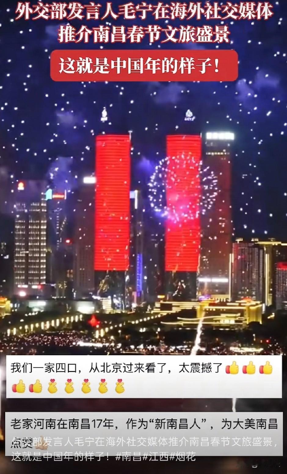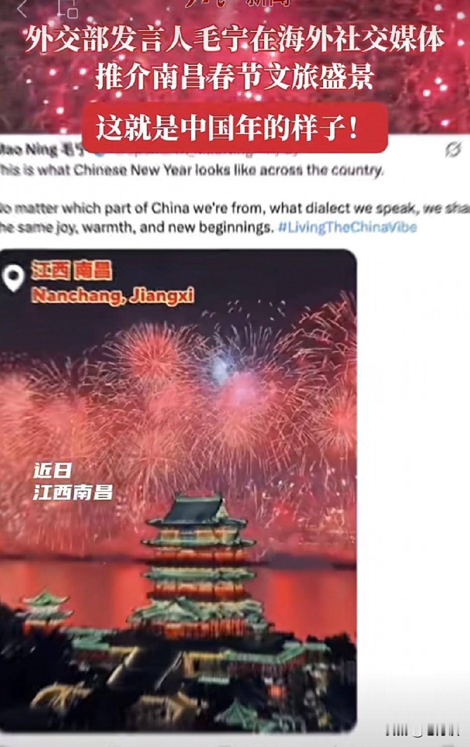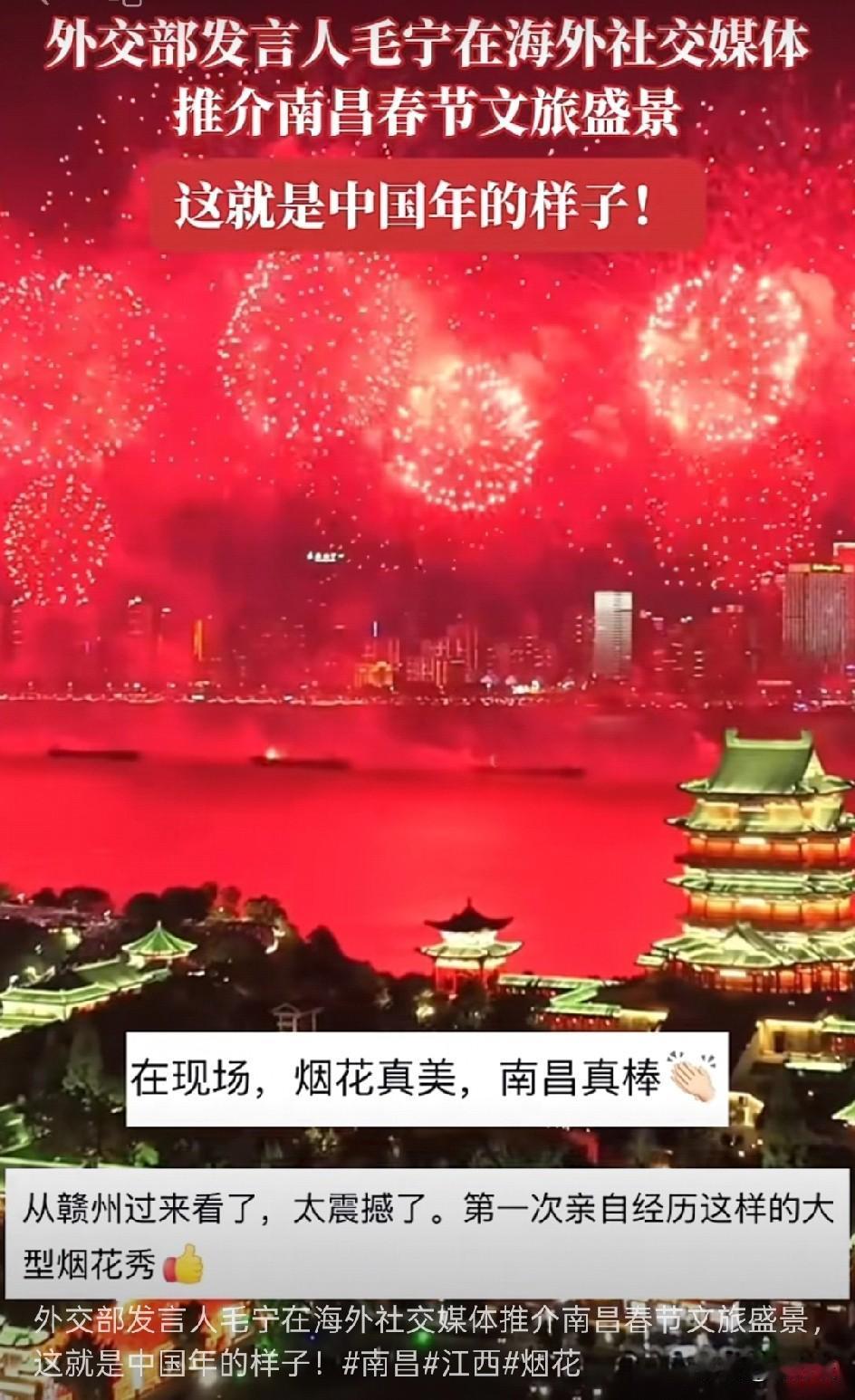外交部发言人毛宁在国外社交媒体推介南昌春节美景,正月初一,南昌大放异彩,在赣江河畔放了几万发烟花,把南昌照得格外的漂亮。毛宁在国外社交媒体推荐了这一事件,称这就是中国过年的样子。确实如此,热热闹闹中国年,这就是中国年的样子。这只是中国年在中部一个中等城市的缩影,在大城市更加的漂亮,这象征着人们的生活蒸蒸日上,象征着国运日益的强盛。