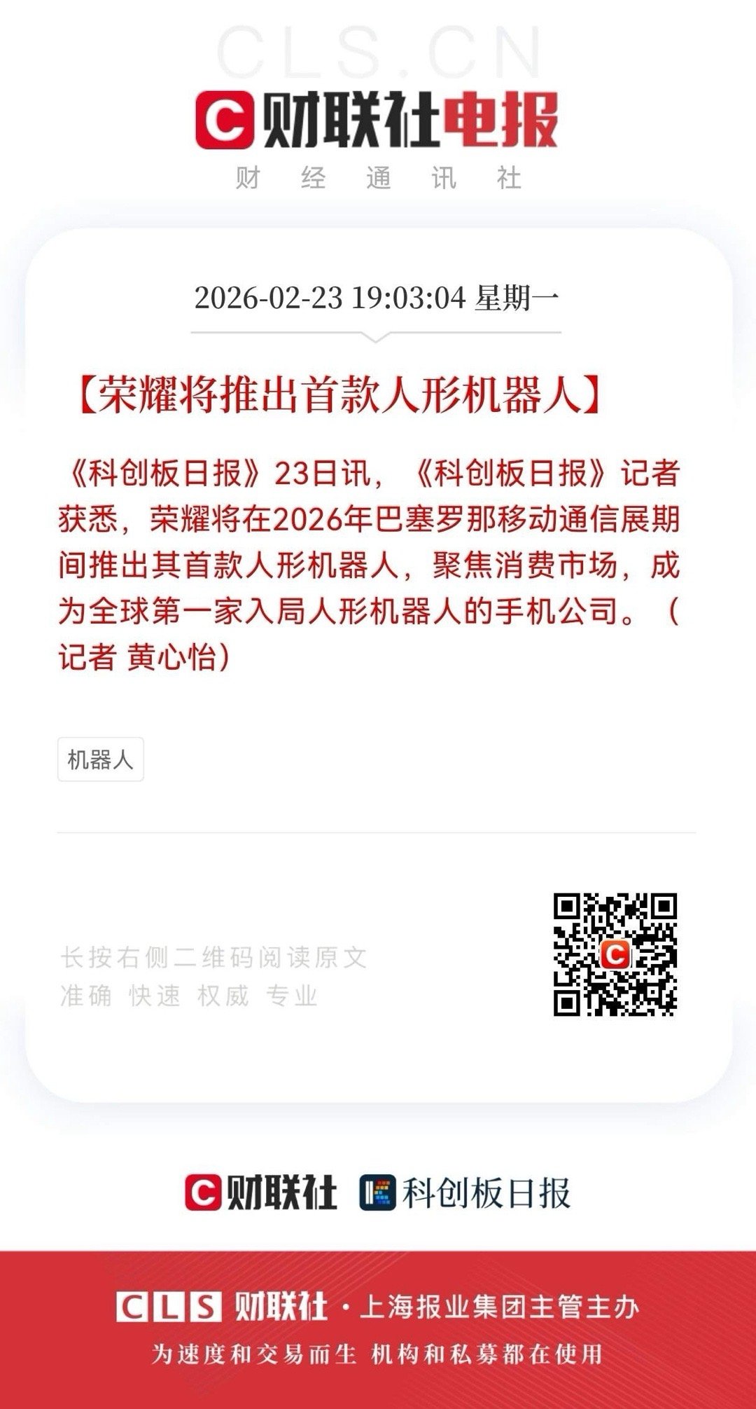 利好!重大利好消息!人形机器人迎新企业,荣耀将推出首款人形机器人,荣耀凭消费级赛