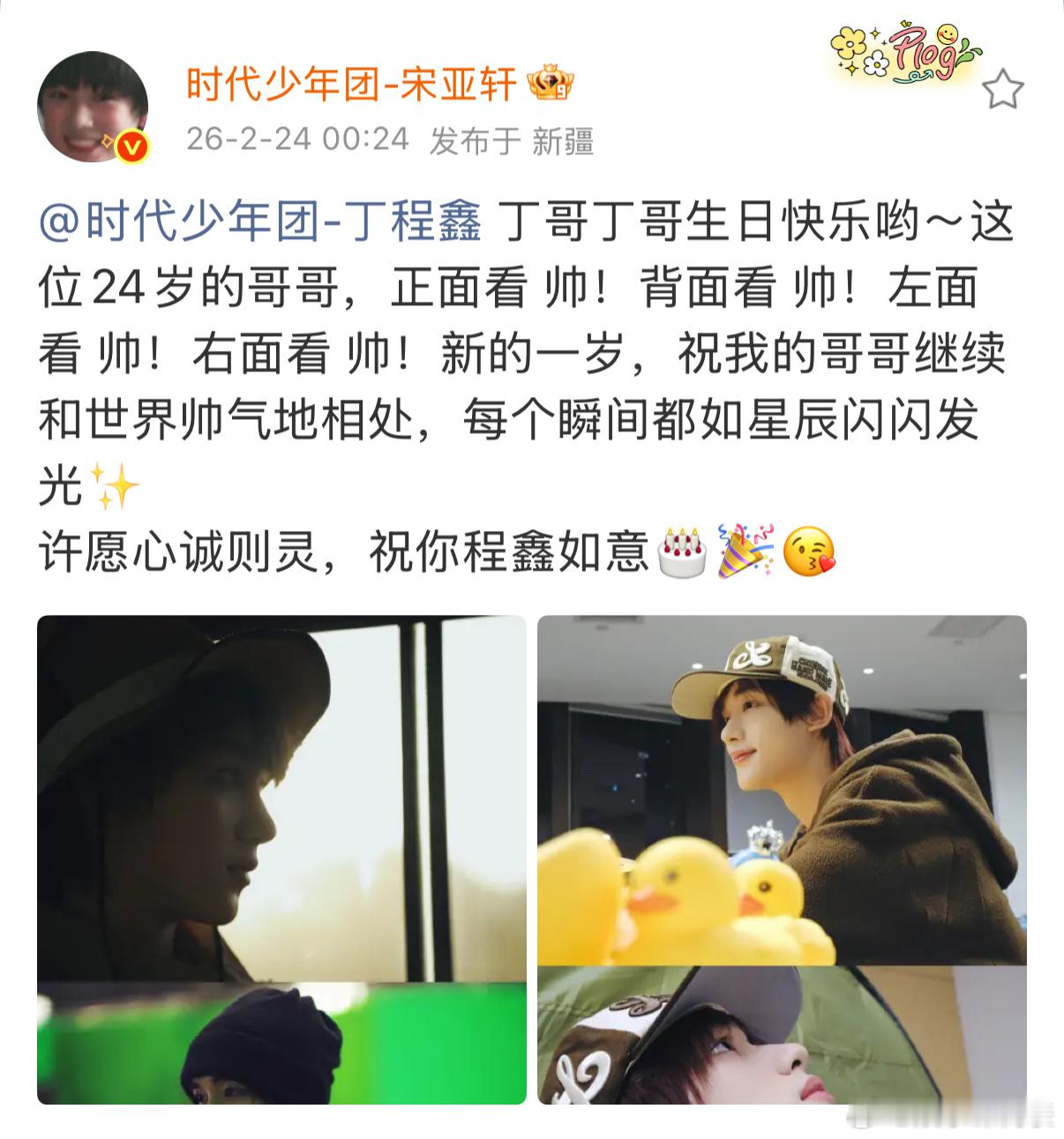 宋亚轩给丁程鑫庆生:“丁哥丁哥生日快乐哟~这位24岁的哥哥,正面看 帅!背面看 帅!左面看 帅!右面看 帅!新的一岁,祝我的哥哥继续和世界帅气地相处,每个瞬间都如星辰闪闪发光✨许愿心诚则灵,祝你程鑫如意🎂🎉😘”