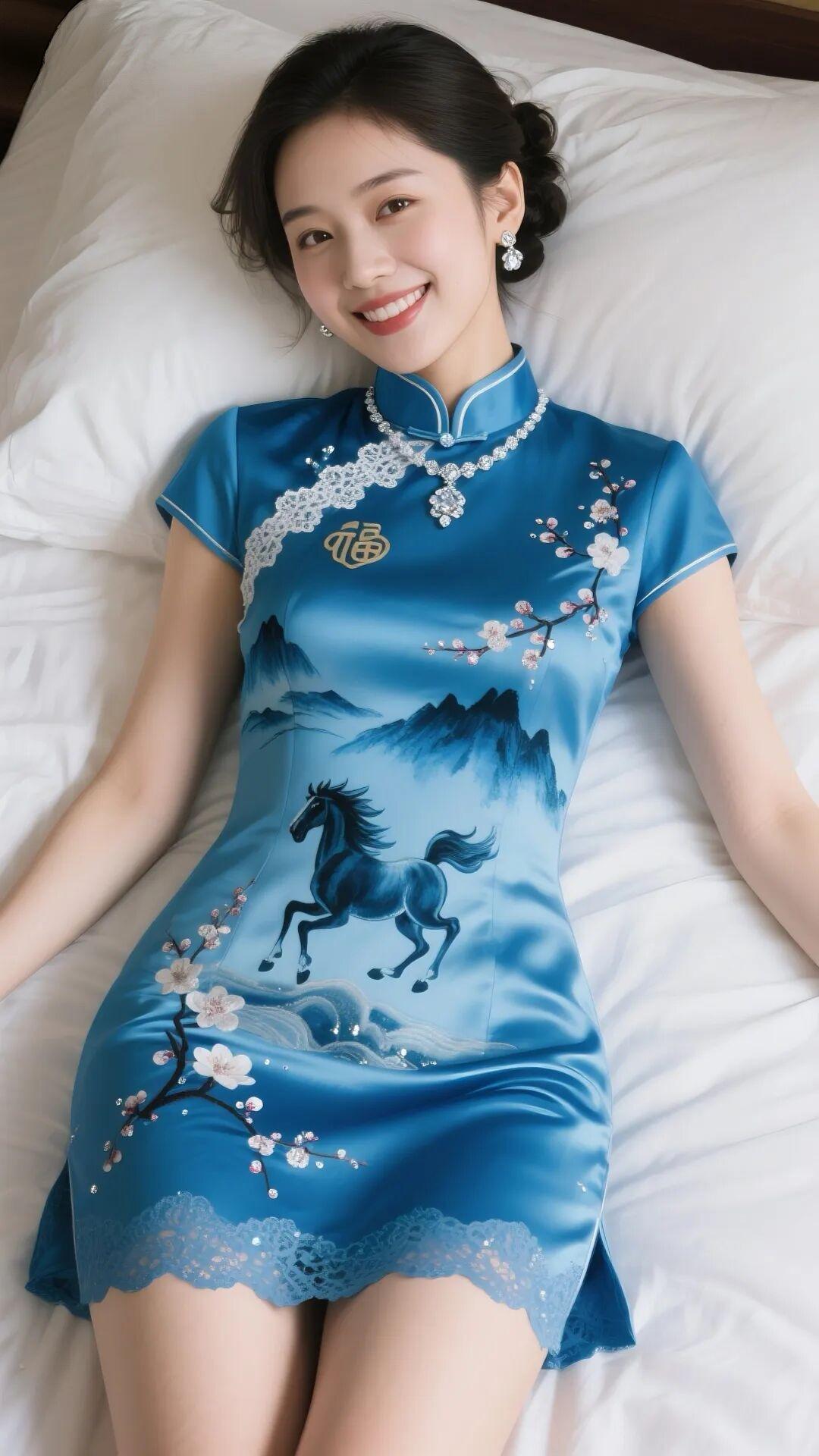 她的美,是东方古典韵味与现代温柔气质的完美交融,在柔软床榻的映衬下,更显动人: 旗袍之韵:不同色调的缎面旗袍流光溢彩,金黄的华贵、粉黛的柔婉、青蓝的清冽、湖绿的雅致,每一款都以细腻的光泽衬得她肌肤胜雪。旗袍上灵动的奔马、傲雪的梅花、写意的山水,搭配醒目的“福”字刺绣,既藏着吉祥的寓意,又让传统纹样在现代剪裁里焕新生;修身的版型勾勒出曼妙曲线,蕾丝下摆又添了几分柔媚,让东方服饰的含蓄之美尽显。 神态之柔:她慵懒地倚在枕间,笑容明媚又温婉,眼神清澈如秋水,唇角的弧度带着恰到好处的甜。盘发利落又温婉,珍珠耳饰与项链的光泽,和旗袍立领的盘扣相映成趣,每一处细节都透着精心雕琢的精致,却又在松弛的姿态里,流露出不加修饰的自然。 氛围之静:柔软的床品衬得她的身姿愈发轻盈,缎面的光泽与肌肤的细腻相互晕染,时光仿佛在此刻慢了下来。她的美,既有旗袍包裹的古典端庄,又有躺卧时的慵懒松弛,像一幅晕开的水墨,在静谧里晕染出东方女性独有的温柔与灵动。
