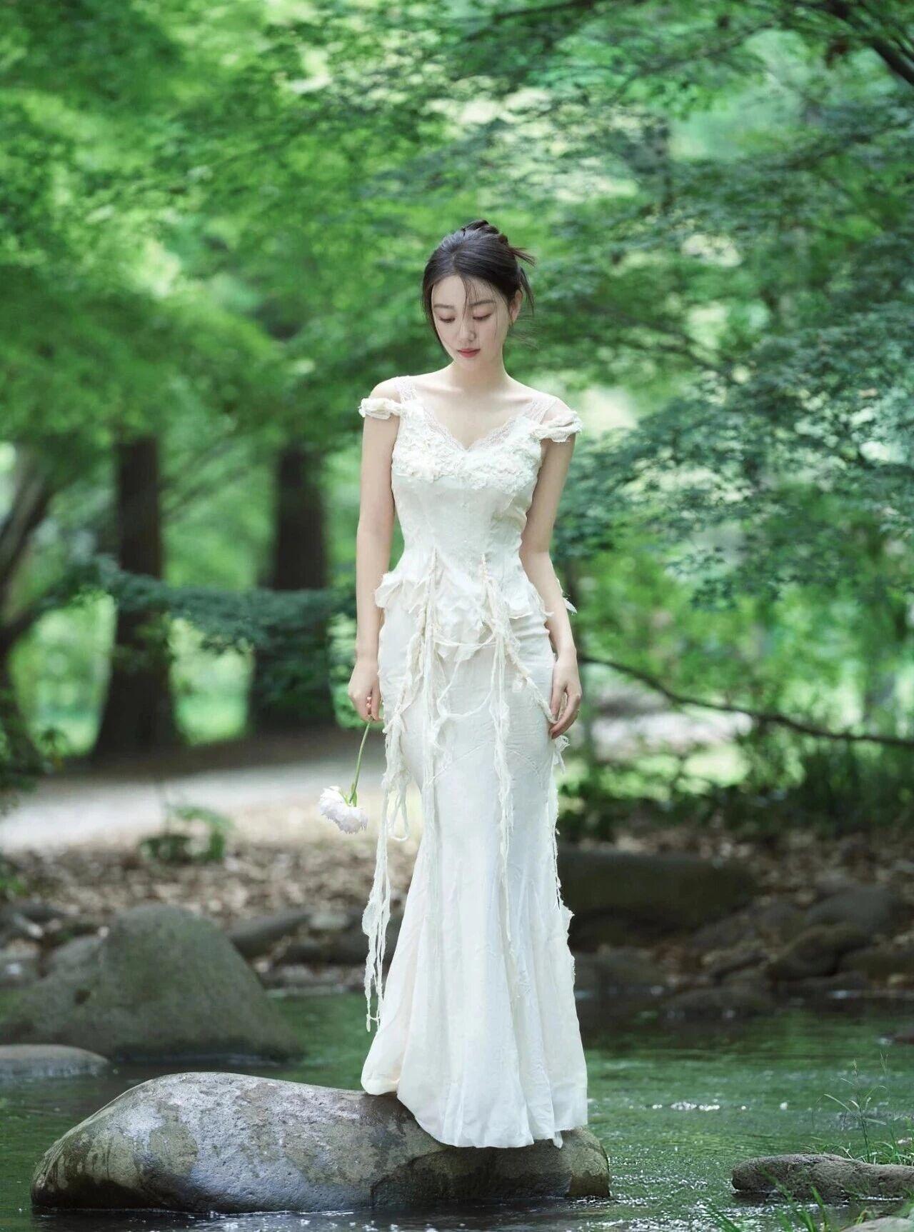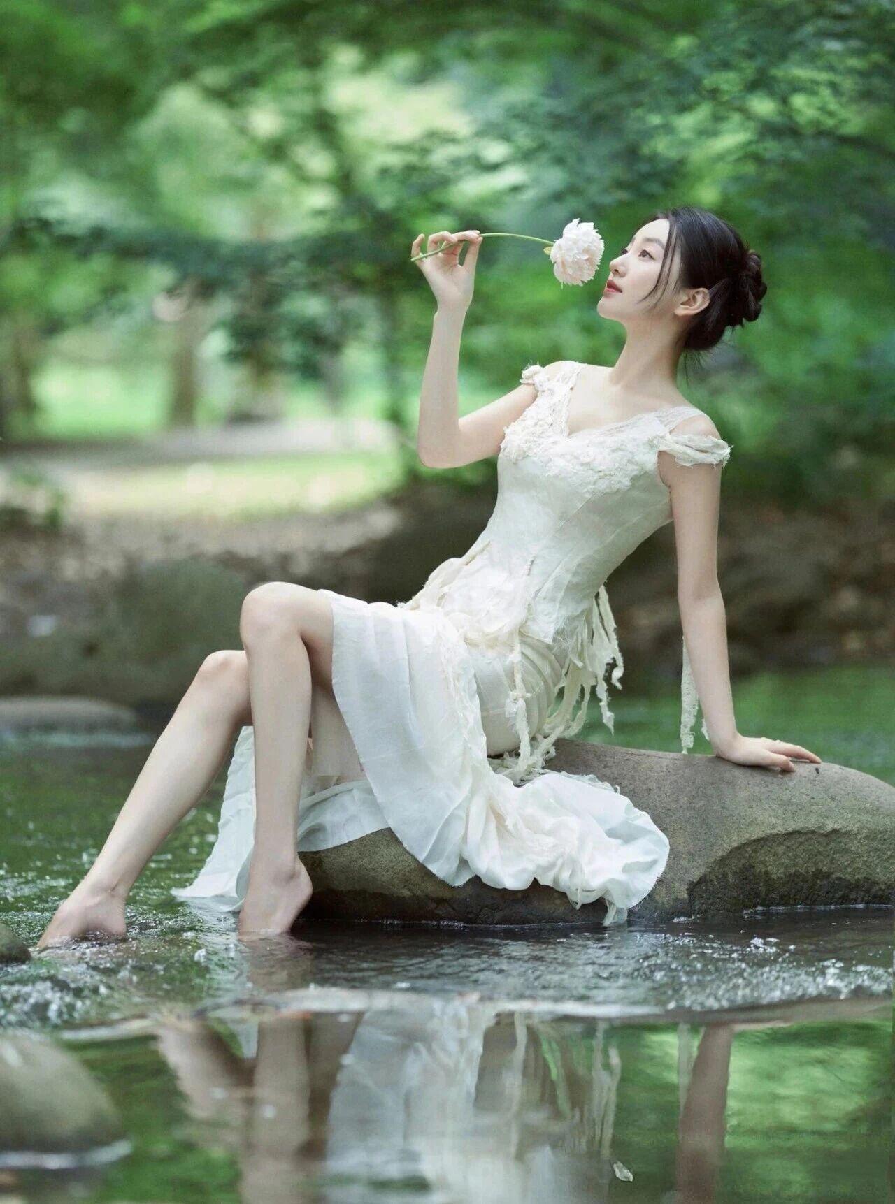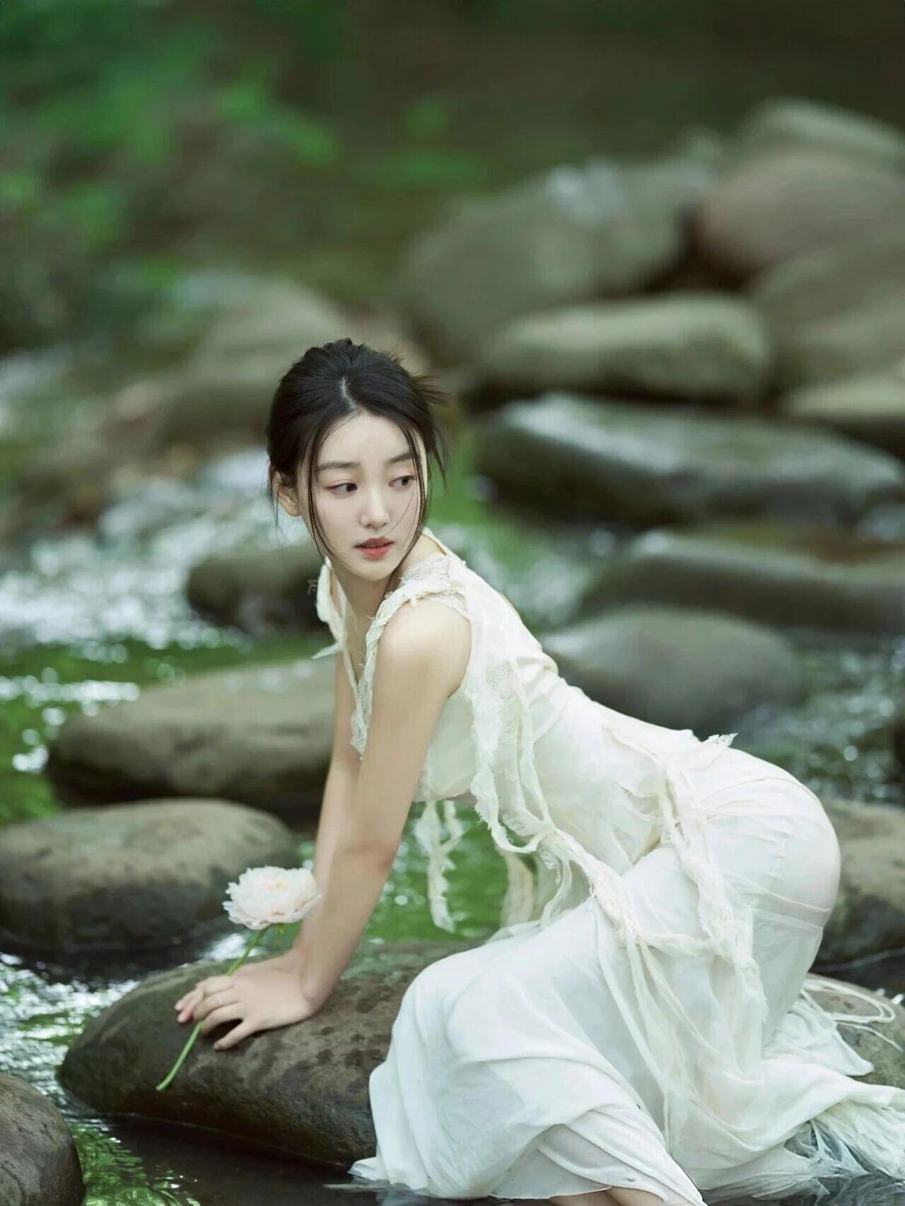 这位女子的美,是自然与温柔的完美交融,在绿意盎然的林间溪边,像从画中走出来的精灵: 气质与氛围:她身处葱郁的树林与清澈的溪水之间,整个人仿佛与自然融为一体,带着一种空灵又治愈的清新感,像林间的风、溪里的水,纯净又温柔。 发型与五官:乌黑的头发挽成松乱的发髻,几缕碎发随意垂在脸颊旁,显得随性又灵动。她的眉眼清澈明亮,眼波流转间带着温柔的光,鼻梁精致,唇色是自然的淡粉,皮肤白皙细腻,在绿意的映衬下更显通透,笑起来时眼尾微微上扬,甜而不腻。 穿搭与线条:一袭白色连衣裙极具设计感,蕾丝与毛边细节带着复古又随性的质感,修身版型勾勒出流畅的身材曲线,垂坠感十足的裙摆随着她的动作轻轻摆动,像一片流动的云,与周围的绿意形成柔和又高级的对比。 神态与姿态:她时而捧着浅粉色的花朵凑近脸庞,眼神专注又温柔;时而仰起头,让发丝在风里轻扬,带着少女的娇俏;时而坐在溪边的石头上,赤足轻触流水,姿态松弛又治愈;时而在林间漫步,裙摆扫过溪水,每一个瞬间都透着灵动与纯净,美得让人忍不住沉醉。