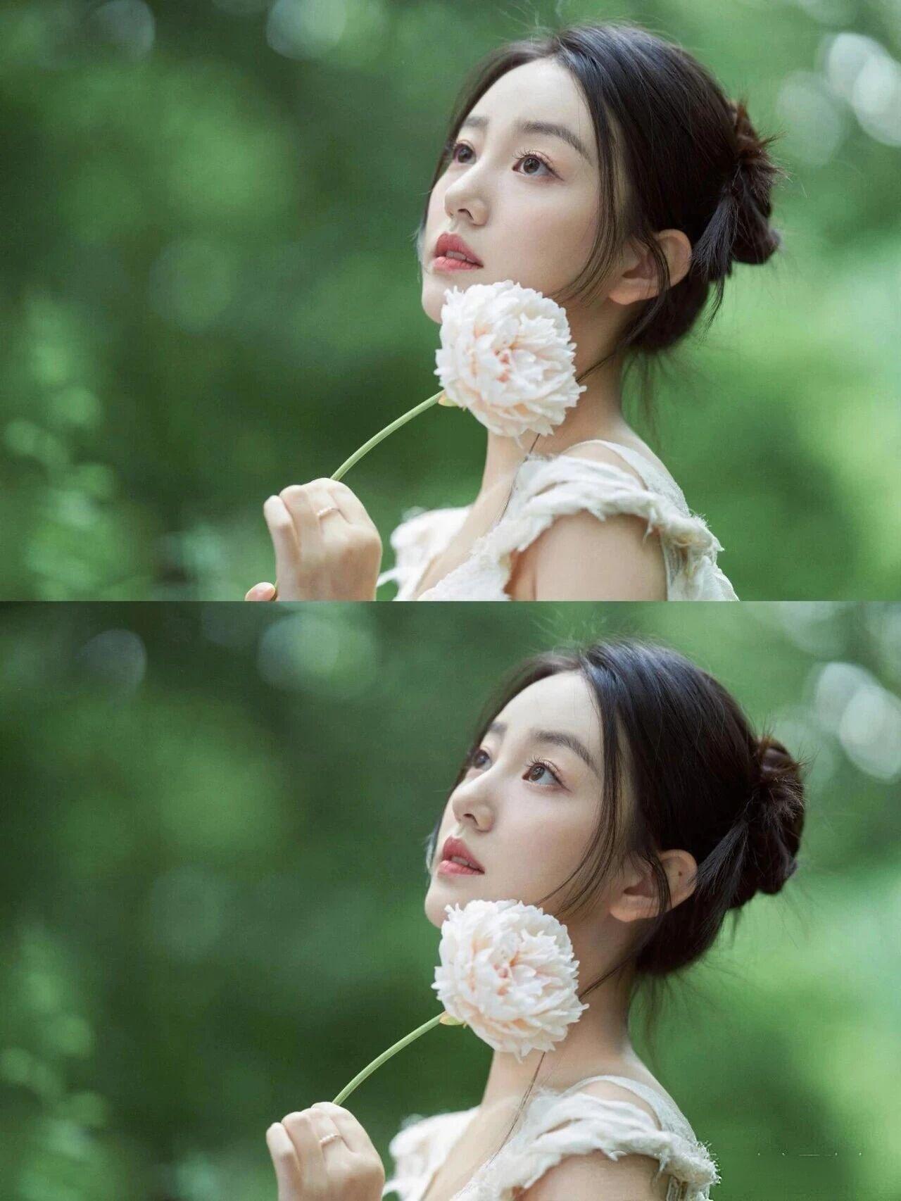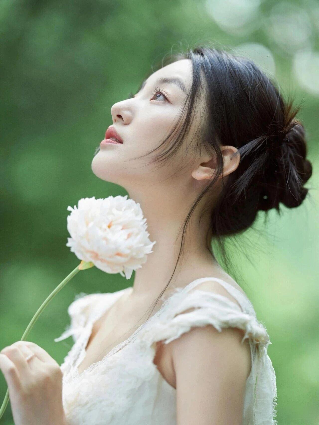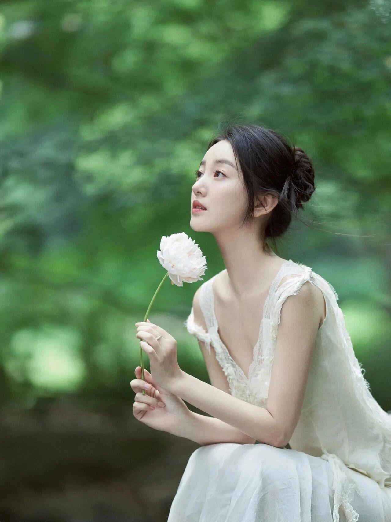 这位女子的美,是自然与温柔的完美交融,在绿意盎然的林间溪边,像从画中走出来的精灵: 气质与氛围:她身处葱郁的树林与清澈的溪水之间,整个人仿佛与自然融为一体,带着一种空灵又治愈的清新感,像林间的风、溪里的水,纯净又温柔。 发型与五官:乌黑的头发挽成松乱的发髻,几缕碎发随意垂在脸颊旁,显得随性又灵动。她的眉眼清澈明亮,眼波流转间带着温柔的光,鼻梁精致,唇色是自然的淡粉,皮肤白皙细腻,在绿意的映衬下更显通透,笑起来时眼尾微微上扬,甜而不腻。 穿搭与线条:一袭白色连衣裙极具设计感,蕾丝与毛边细节带着复古又随性的质感,修身版型勾勒出流畅的身材曲线,垂坠感十足的裙摆随着她的动作轻轻摆动,像一片流动的云,与周围的绿意形成柔和又高级的对比。 神态与姿态:她时而捧着浅粉色的花朵凑近脸庞,眼神专注又温柔;时而仰起头,让发丝在风里轻扬,带着少女的娇俏;时而坐在溪边的石头上,赤足轻触流水,姿态松弛又治愈;时而在林间漫步,裙摆扫过溪水,每一个瞬间都透着灵动与纯净,美得让人忍不住沉醉。