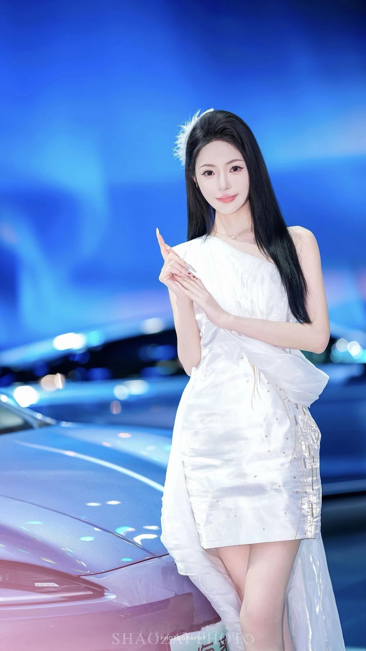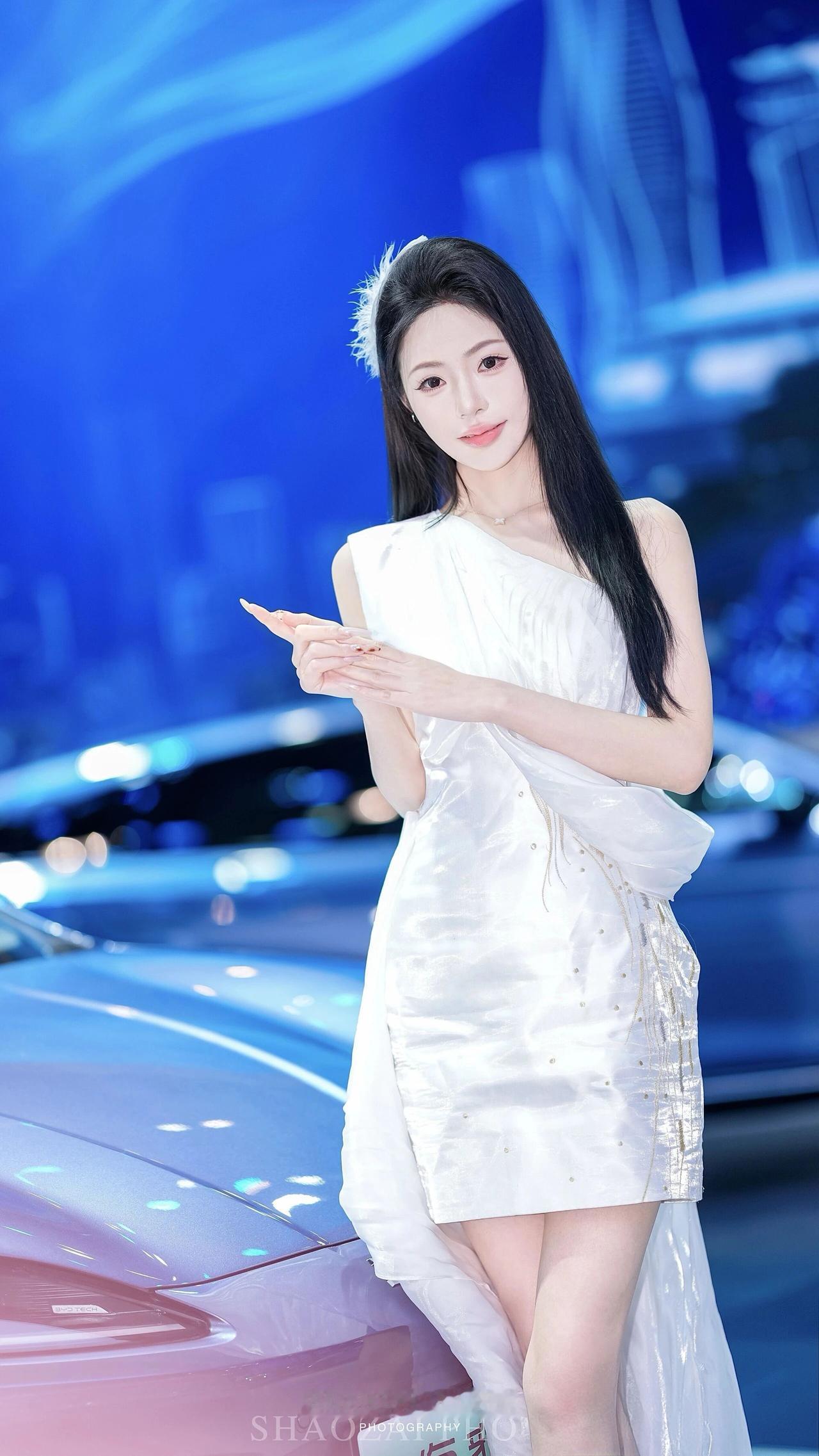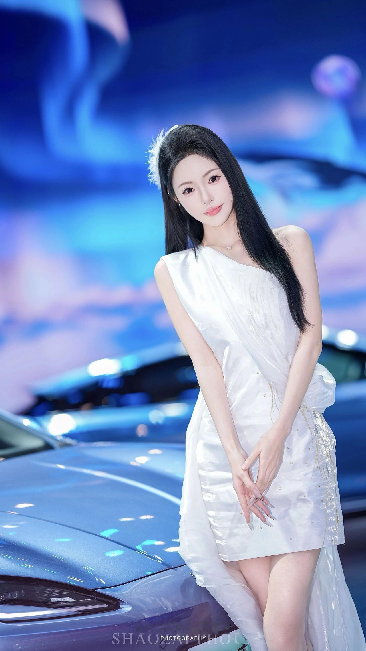 在车展的璀璨灯光里,她一袭白裙,美得自带焦点✨ 穿搭与气场:单肩设计的白色长裙,缎面材质在灯光下泛着细腻光泽,前短后长的剪裁利落又飘逸,金色刺绣与碎钻点缀其间,既显精致又不失大气。搭配同色系高跟鞋,衬得双腿修长,每一步都带着从容的气场。 神态与姿态:乌黑长发垂顺如瀑,额间的羽毛发饰添了几分灵动。她时而轻抬手臂,眼神清澈又自信;时而侧身倚靠车身,曲线优雅;时而张开双臂,笑容明媚,仿佛在邀请所有人共赴这场视觉盛宴。 氛围与张力:在蓝调背景与金属车身的映衬下,她的白裙愈发纯净亮眼,像从未来驶来的精灵,把科技感与东方柔美完美融合,成为整个车展里最让人移不开眼的风景。