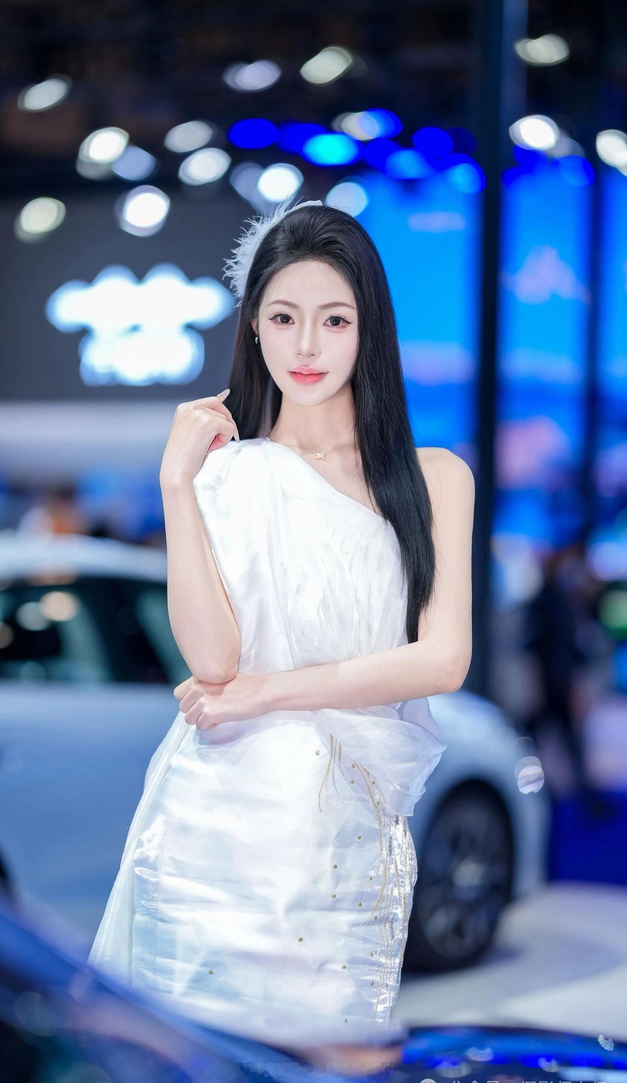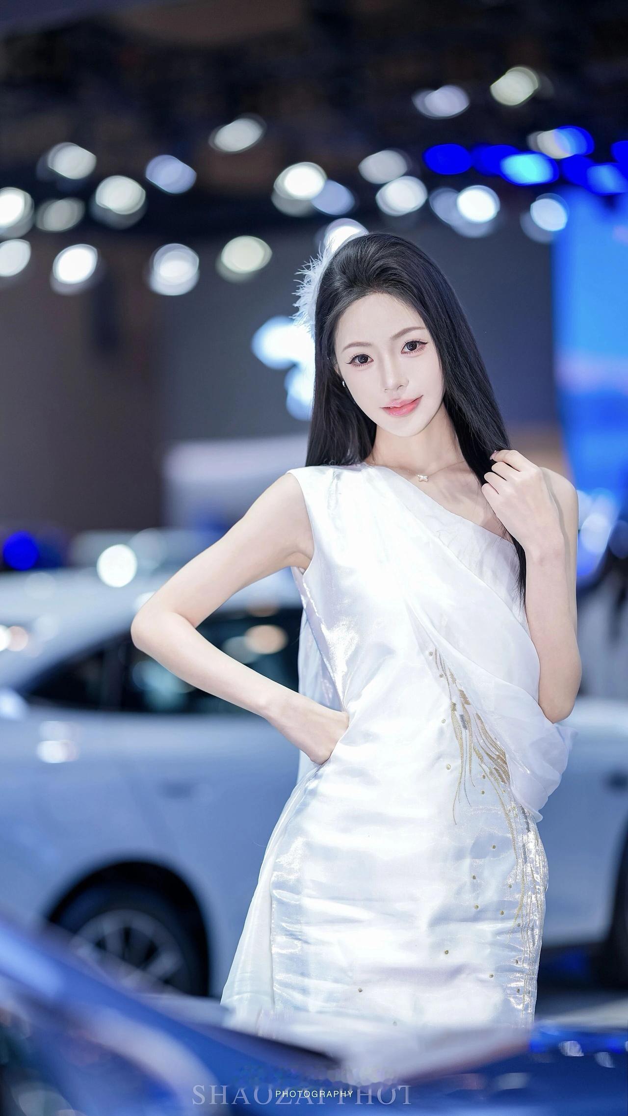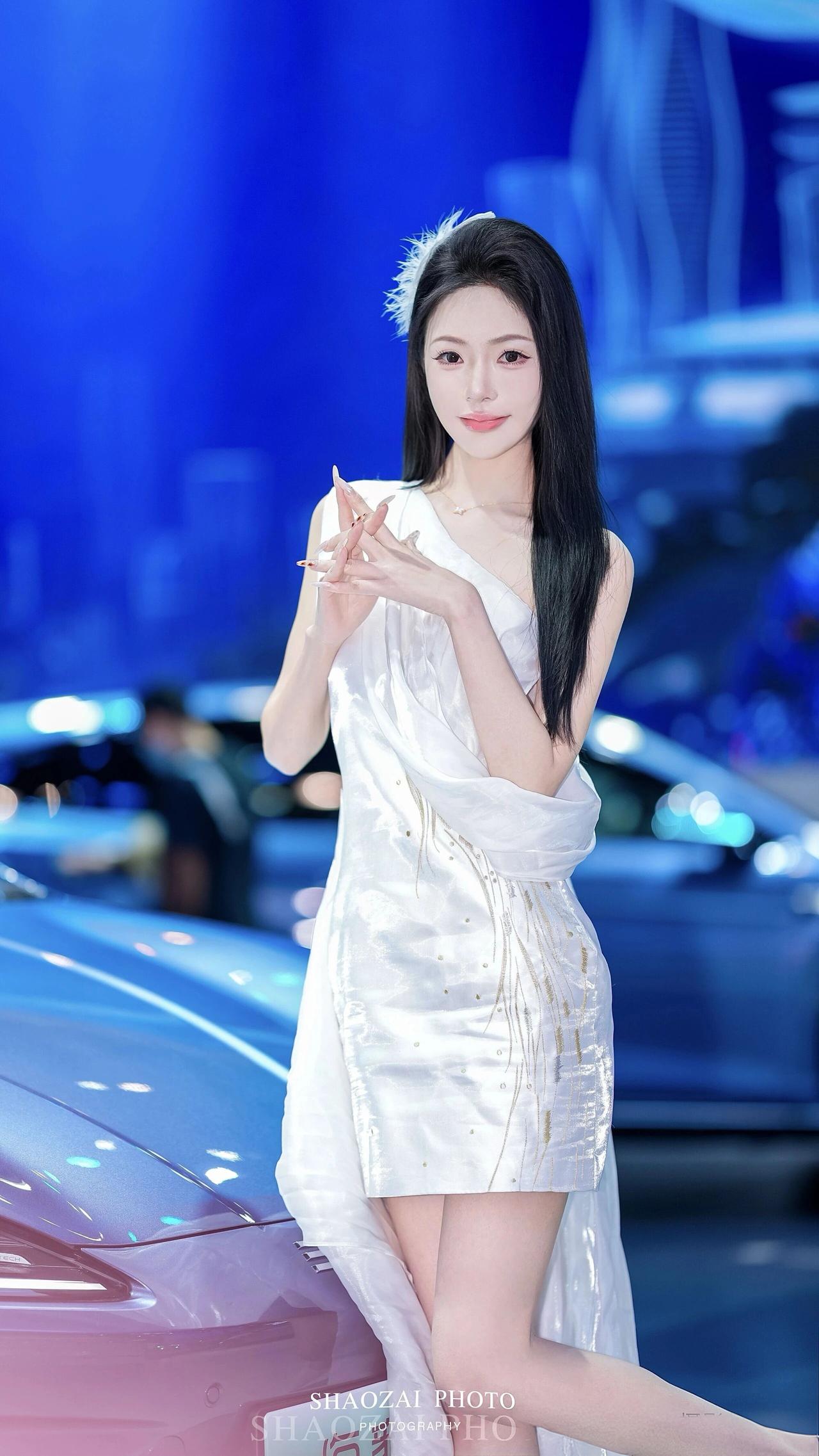在车展的璀璨灯光里,她一袭白裙,美得自带焦点✨ 穿搭与气场:单肩设计的白色长裙,缎面材质在灯光下泛着细腻光泽,前短后长的剪裁利落又飘逸,金色刺绣与碎钻点缀其间,既显精致又不失大气。搭配同色系高跟鞋,衬得双腿修长,每一步都带着从容的气场。 神态与姿态:乌黑长发垂顺如瀑,额间的羽毛发饰添了几分灵动。她时而轻抬手臂,眼神清澈又自信;时而侧身倚靠车身,曲线优雅;时而张开双臂,笑容明媚,仿佛在邀请所有人共赴这场视觉盛宴。 氛围与张力:在蓝调背景与金属车身的映衬下,她的白裙愈发纯净亮眼,像从未来驶来的精灵,把科技感与东方柔美完美融合,成为整个车展里最让人移不开眼的风景。