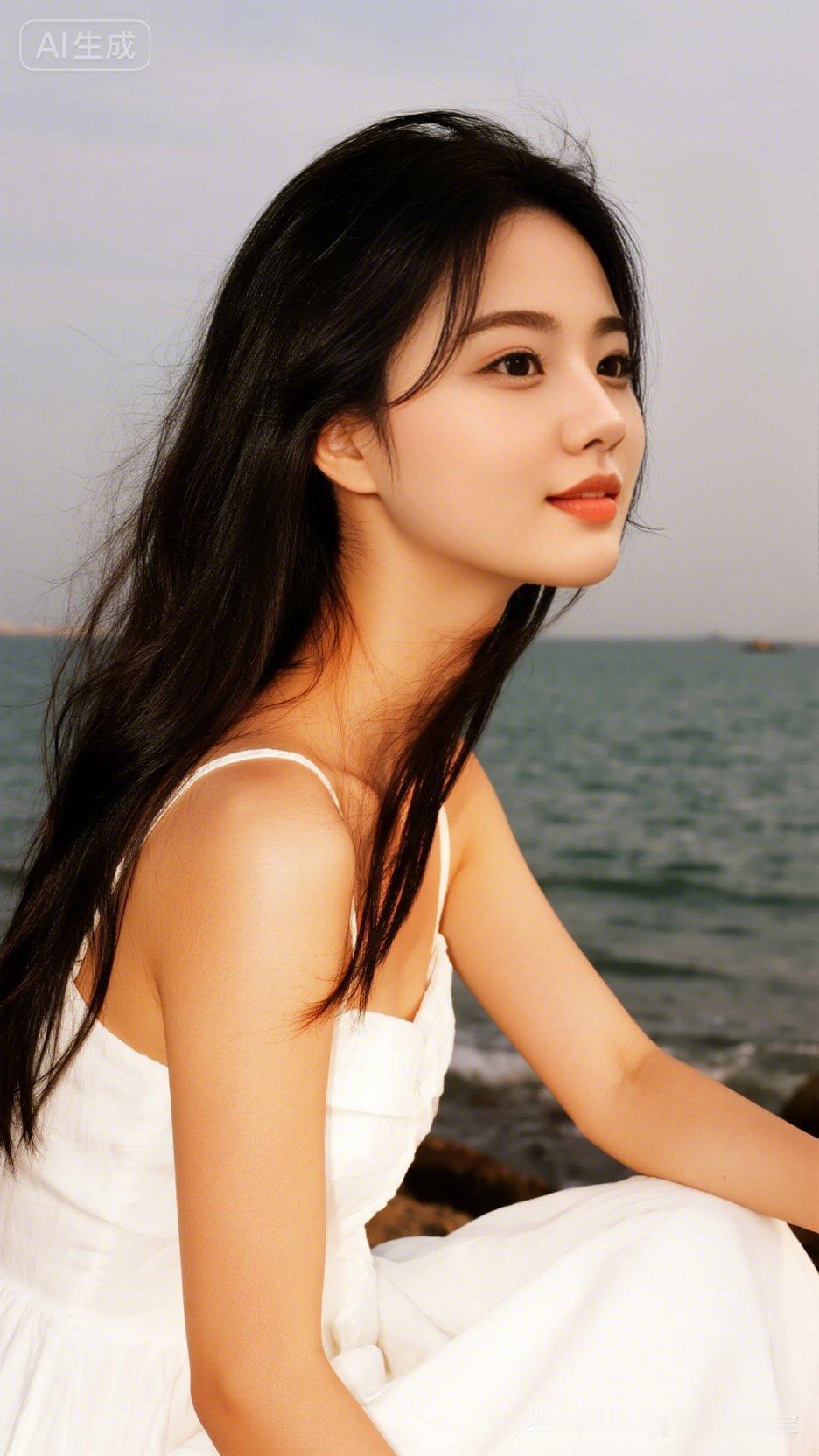 海边少女,温柔微笑,白色连衣裙,海风轻拂,岁月静好。
