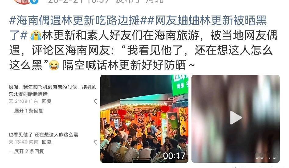 别怀疑,这就是林更新。 在海南待久了,从唇红齿白的九爷,直接晒成了夜市里最接地气的“黑炭”兄弟。 你猜怎么着? 从录《新游记》到拍《现在就出发》,再到今年过年赖在海边不走,他的肤色就是一部在海南的“定居史”。 这次被拍到,他正坐在吱呀响的塑料凳上,面前是滋滋冒油的烤串,白T恤后背被汗洇出深一块浅一块的印子。 说实话,内娱能把偶像包袱扔得这么彻底的,没几个。 别的明星防晒霜按斤抹,他倒好,把阳光当佐料,就着锅包肉和海鲜烧烤一起吞下肚。 网友喊他防晒,他回你一个更黑的笑脸。 在海南的林更新,晒黑的不是皮肤,是铠甲;踩着的不是拖鞋,是生活。 他从荧幕里走出来,一屁股坐进了人间烟火里。 这哪是度假,这分明是给自己换了种活法。