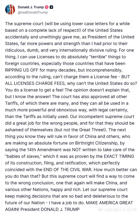 美国最高法院(鉴于其完全缺乏尊重,我将暂时使用小写字母!)无意中赋予了我,作为美国总统,比他们之前荒谬、愚蠢且极具国际争议的裁决赋予的权力和影响力要大得多。