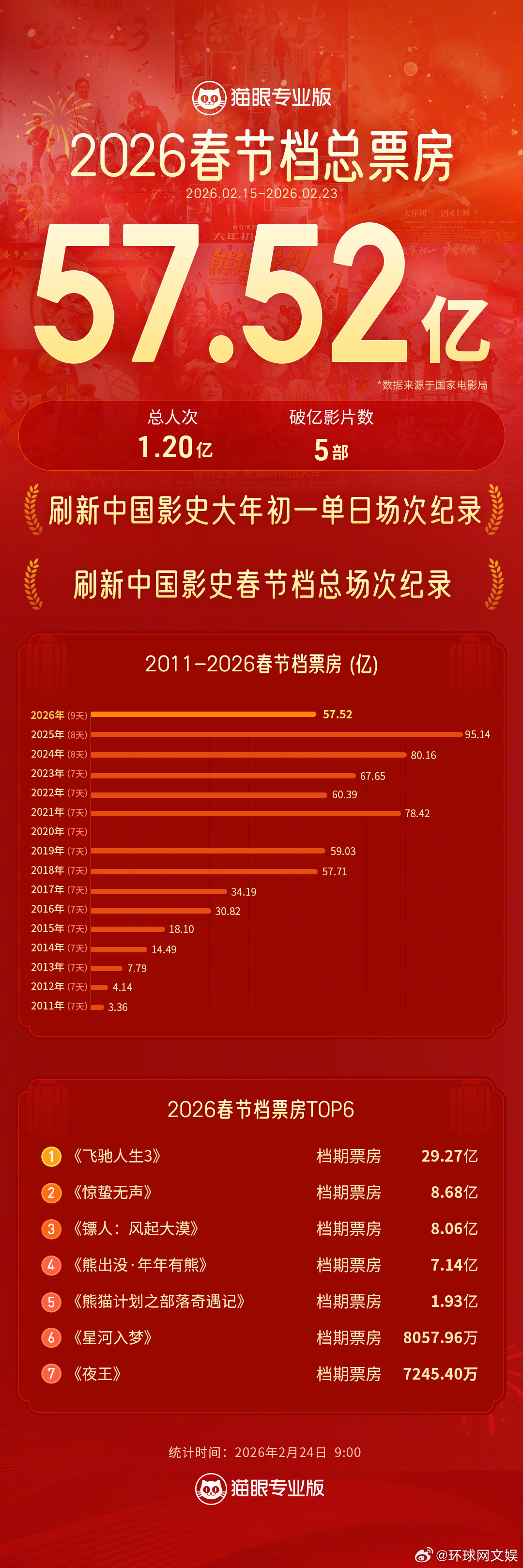 【#2026年春节档总票房57.52亿元# 】据国家电影局数据,截至今日9:00,#2026年春节档# 票房为57.52亿元,观影人次为1.20亿,春节档上映的影片票房分别为:《飞驰人生3》29.27亿元,《惊蛰无声》8.68亿元,《镖人:风起大漠》8.06亿元,《熊出没·年年有熊》7.14亿元,《熊猫计划之部落奇遇记》1.93亿元,《星河入梦》8057.96万元,《夜王》7245.40万元。#飞驰人生3成春节档票房冠军#