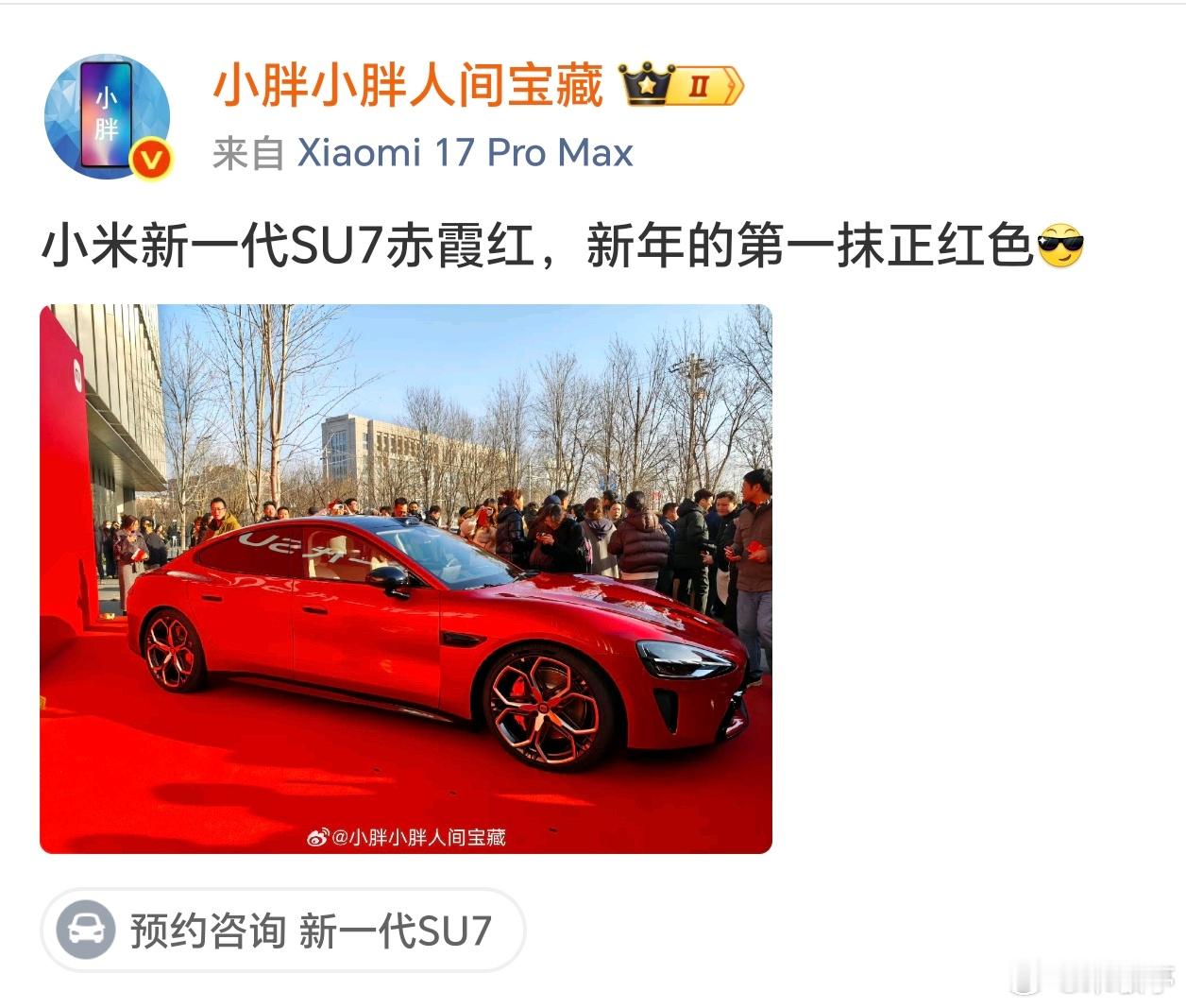 马年开工,新一代小米SU7带来首款赤霞红车漆,与卡布里蓝组成亮眼红蓝CP。赤霞红这抹红不是普通的艳红,而是高饱和度、色调纯正的豪华运动色,阳光下光泽通透、质感细腻,自带高级感,和SU7的运动定位格外般配。同级别红色不少,但能把红色做得耐看、大气、不浮夸。作为SU7系列首款红色主打色,赤霞红不止好看,更有好寓意。新年开红车,红红火火、红运当头,既是出行气场,也是新年好彩头。选它的人,大多自信从容、不甘平庸。不张扬,却足够有辨识度;够运动,也够有格调。新年红运正当头,寓意也非常好。小米新SU7赤霞红