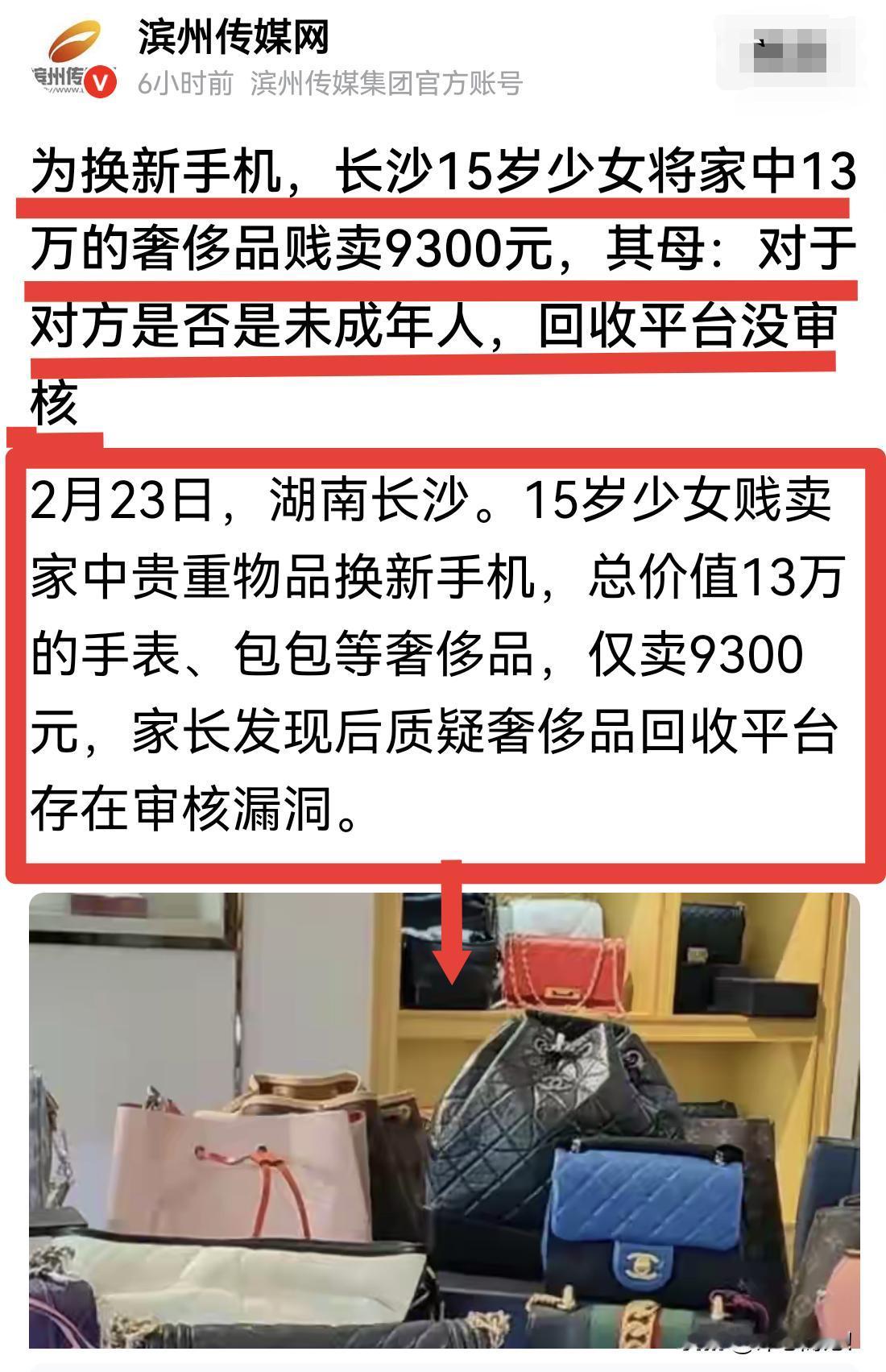 扎心!13万奢侈品贱卖9300!这是教育缺位!2月23日,长沙15岁少女为换新手机,将家中13万的奢侈品贱卖9300元,其母对平台提出质疑,对于对方是否是未成年人,回收平台没审核。 15岁的孩子,对钱、对贵重物品、对“家里资产”根本没建立认知。她只知道“我有东西”去换“我想要的东西(手机) ”。这不是坏,也不是败家,只能说是教育的缺位。关键问题还是在于她的母亲——教育缺位,靠钱是养不出懂事的孩子;无底线的宠溺,只会养出不懂珍惜、不计后果的孩子。 评心而论:家里再有钱,没教好就是最大失败。同时,慈母多败儿,这句话放在今天依然不过时。