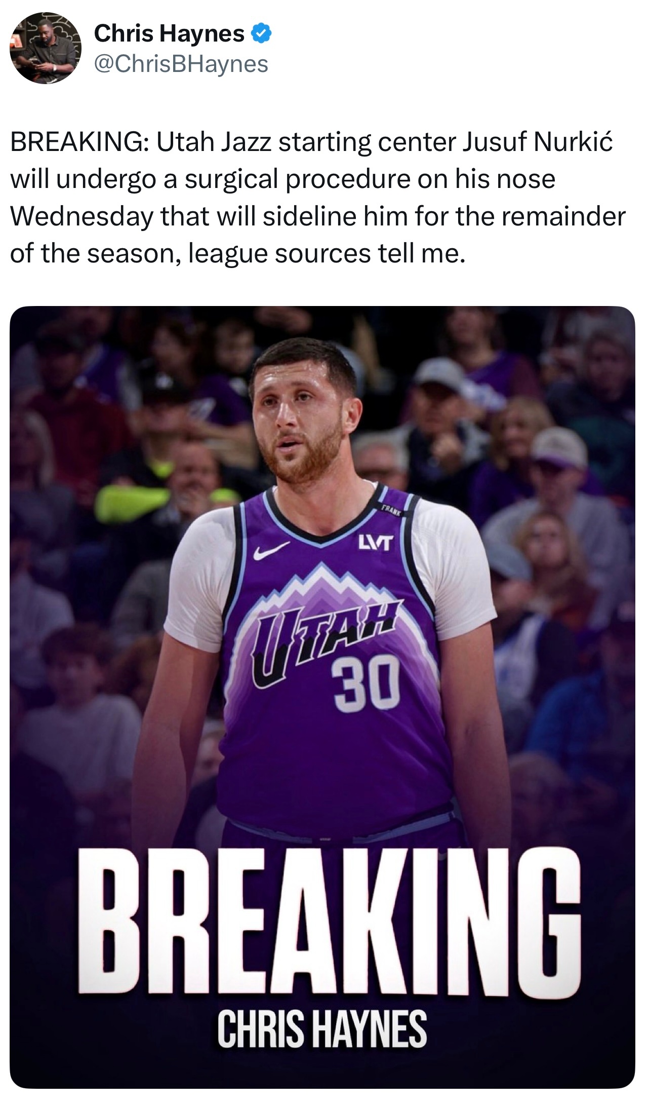 Chris Haynes:爵士中锋努尔基奇鼻子做手术赛季报销。