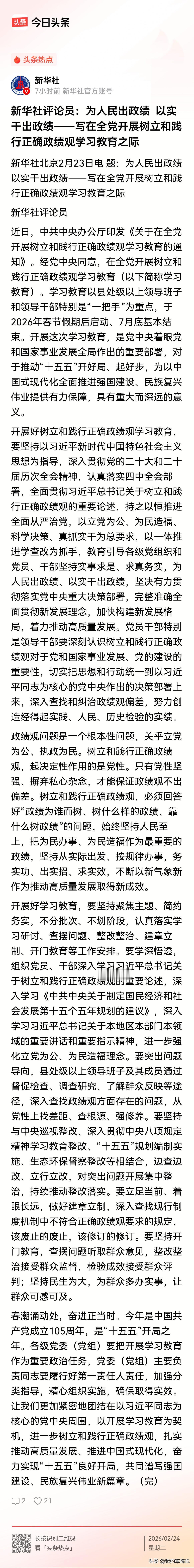 让民生为大成为政绩底色!政绩观映照着党性修养,也决定着发展路径的实际成效。即将在全党开展的树立和践行正确政绩观学习教育,正是为了校准思想偏差,让“民生为大”成为最鲜明的政绩底色。 “民生为大”不是抽象的口号,而应转化为群众可感可及的具体行动。坚持开门教育,就是要让群众意见成为查摆问题的镜子,让群众监督成为整改落实的鞭子,让群众评判成为检验成效的尺子。这种全过程人民参与,既是对形式主义、官僚主义的有效遏制,更是对“为人民出政绩”本质的回归。 为群众多办实事,关键在“实”——实情要摸清、实事要办好、实效要可见。从老旧小区改造到就业岗位扩容,从医疗服务下沉到人居环境提升,每一项民生实事都应是精准对接群众需求的“暖心工程”。当政绩追求与民生期盼同频共振,当发展成果由人民共享,这样的政绩才经得起历史和人民检验。