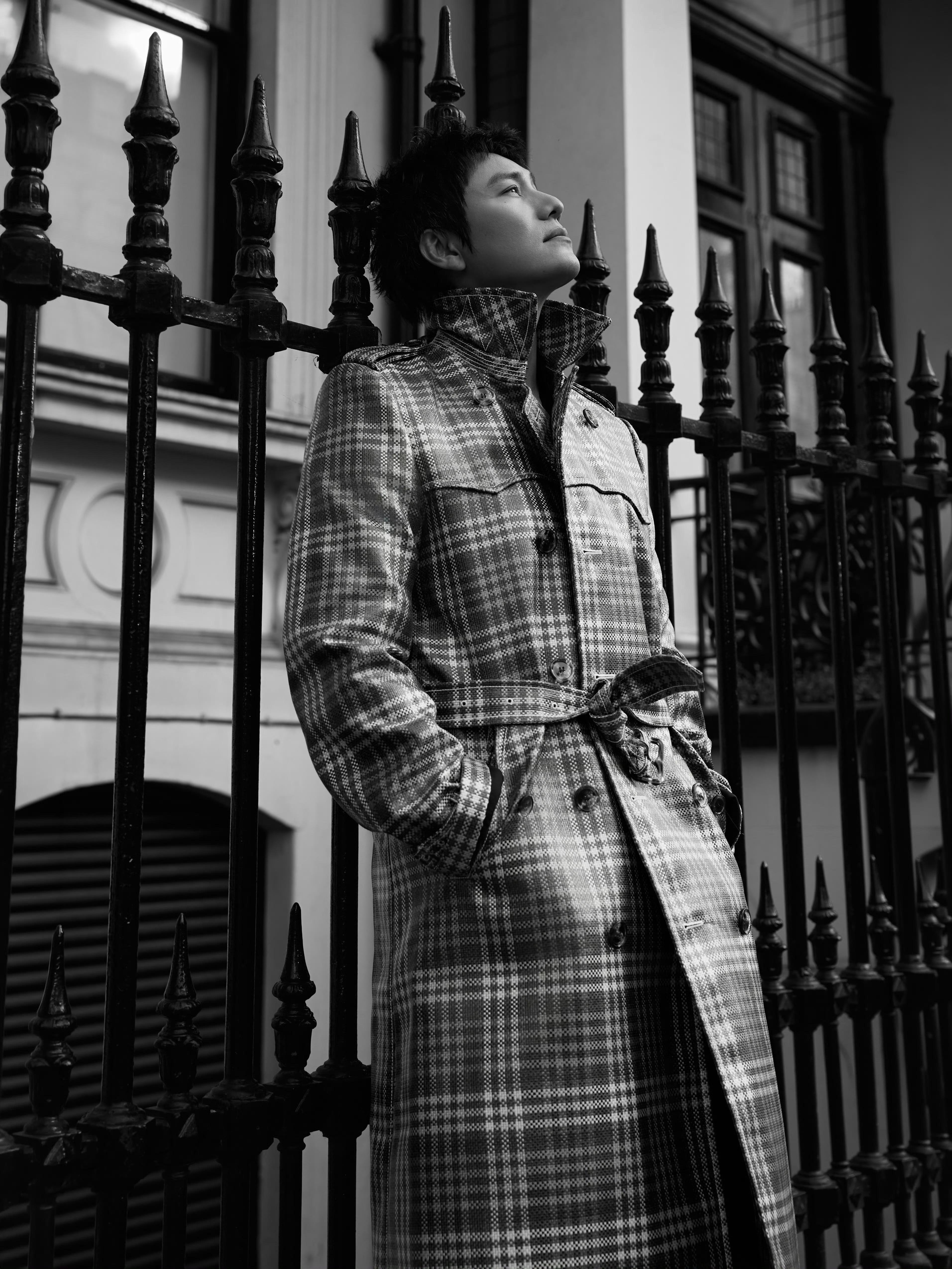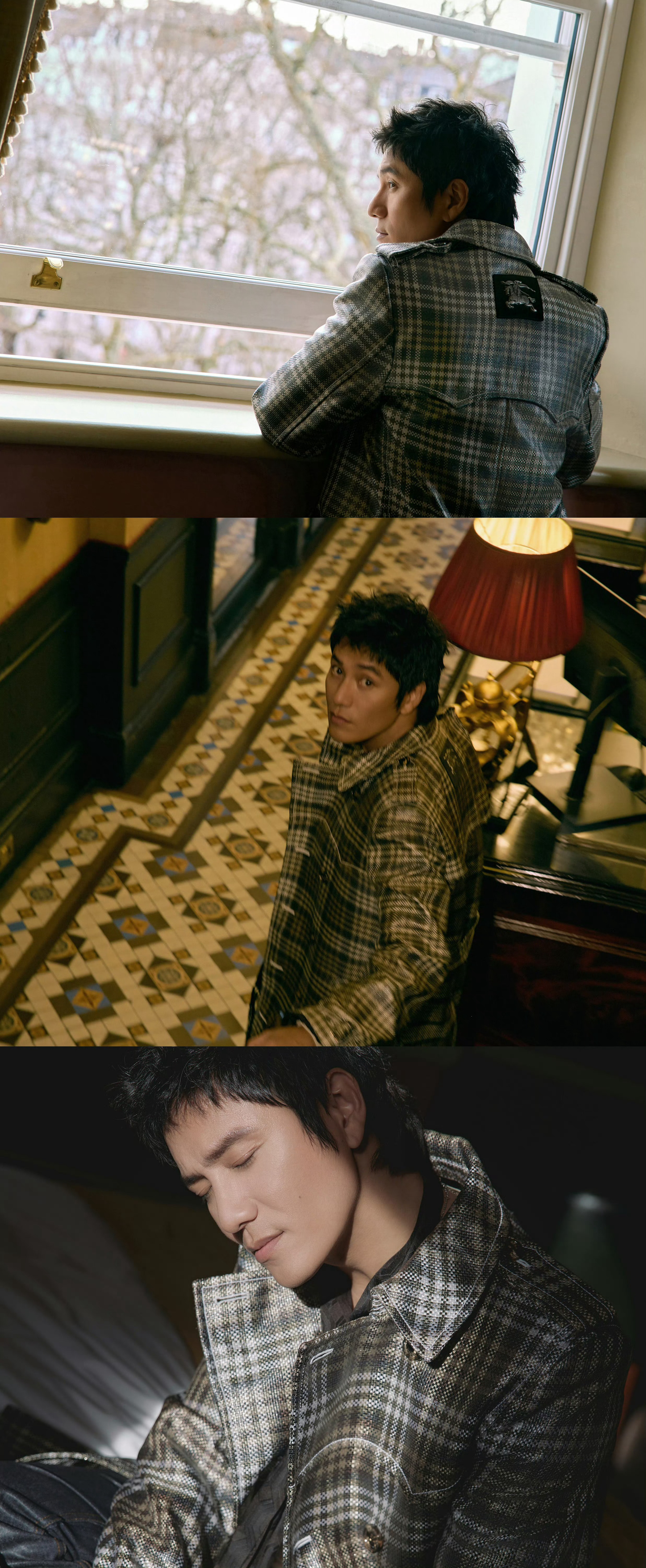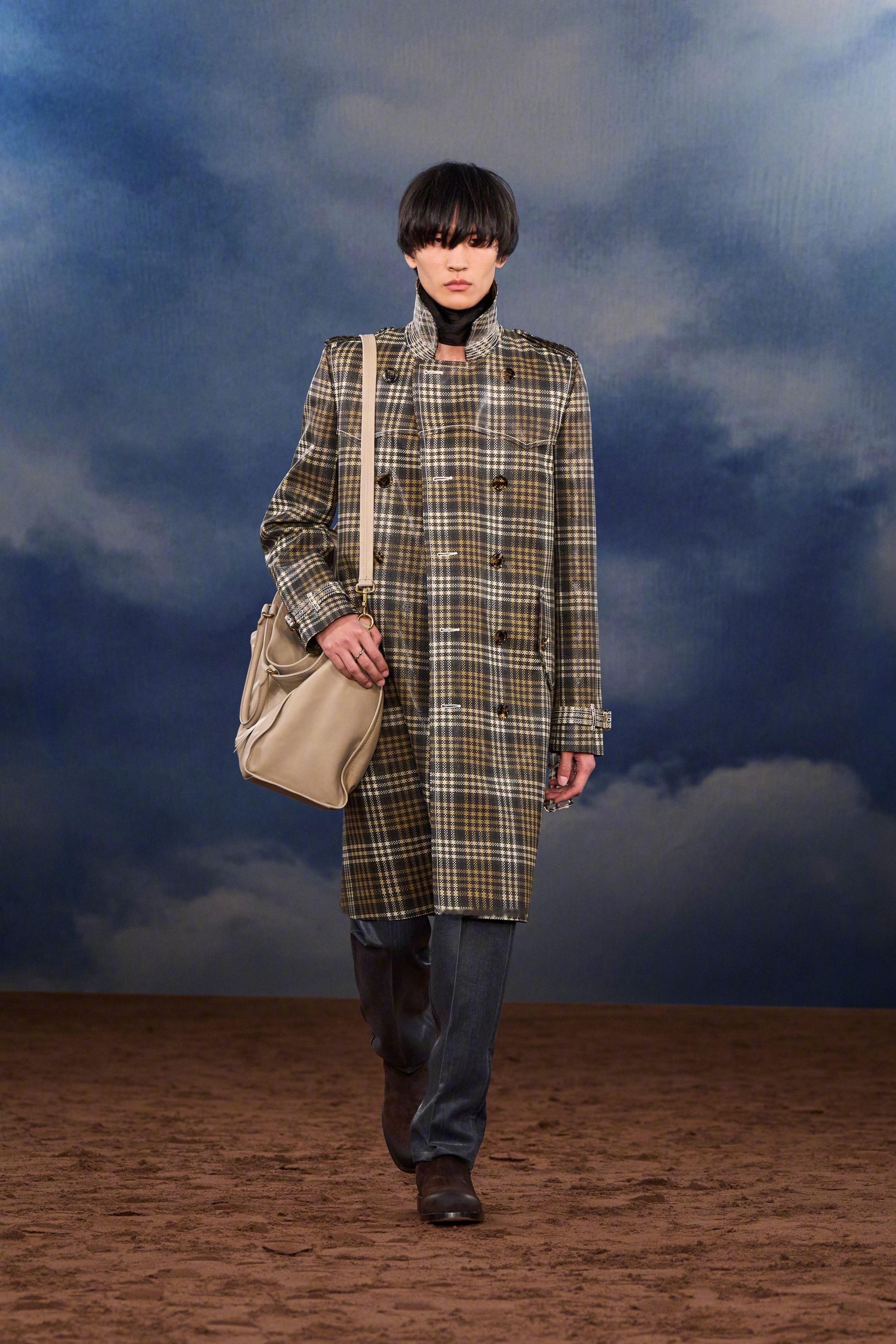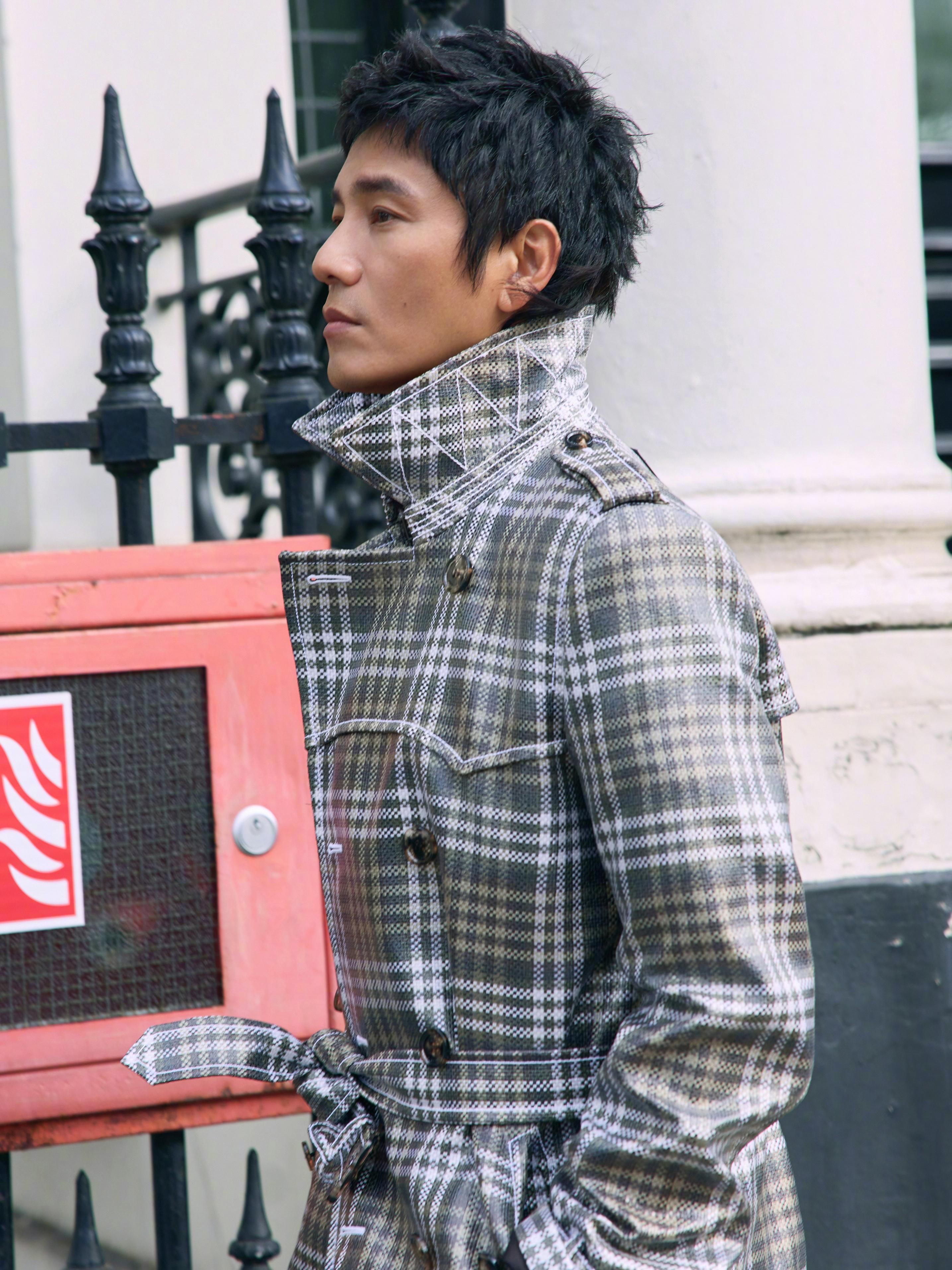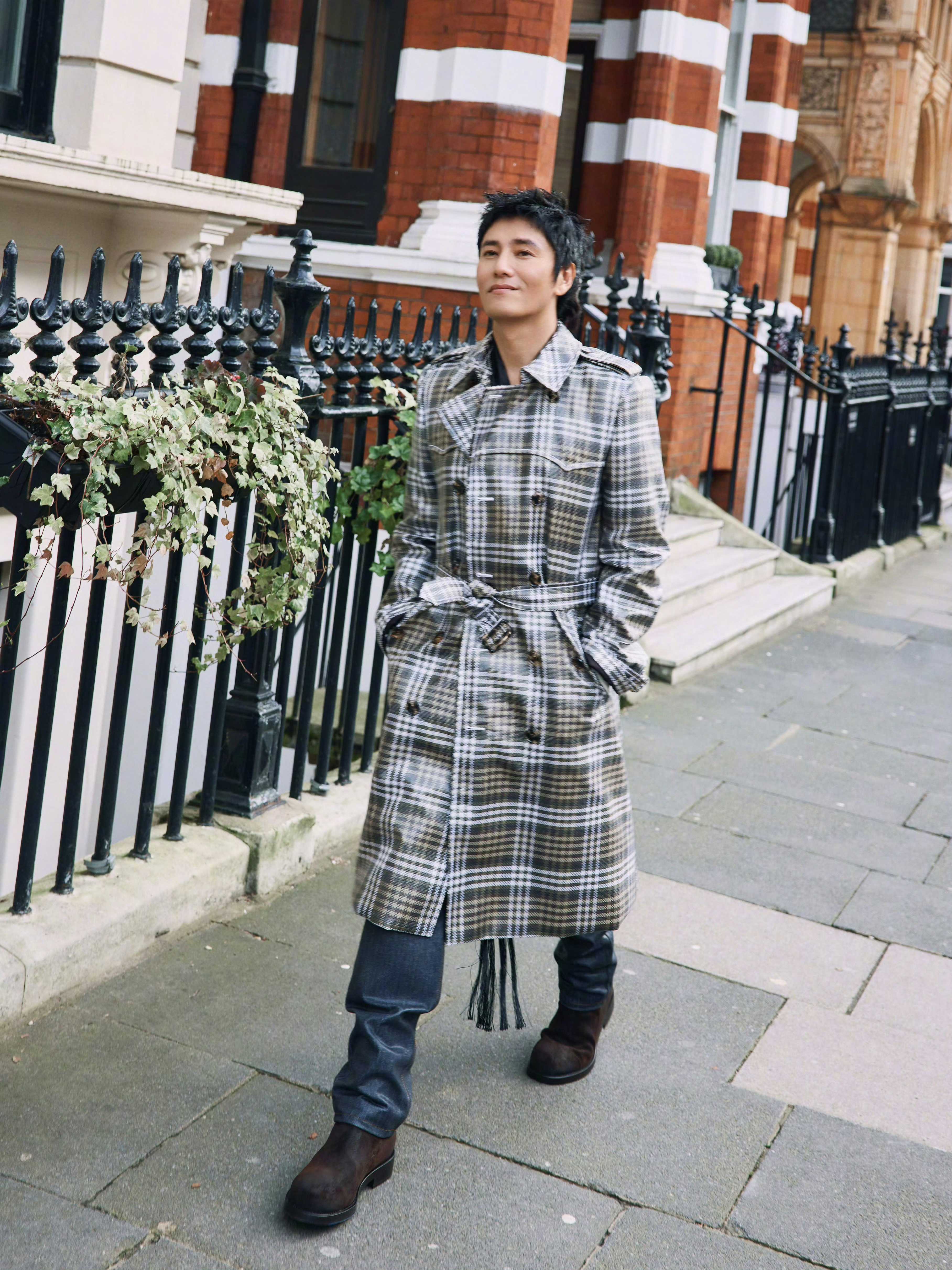 出席Burberry 2026秋冬系列发布秀的陈坤,身穿2026春夏季系列格纹涂层Trench风衣和牛仔裤,配搭流苏围巾,英伦风十足的一身造型。发型设计很有年代感。伦敦时装周时装周