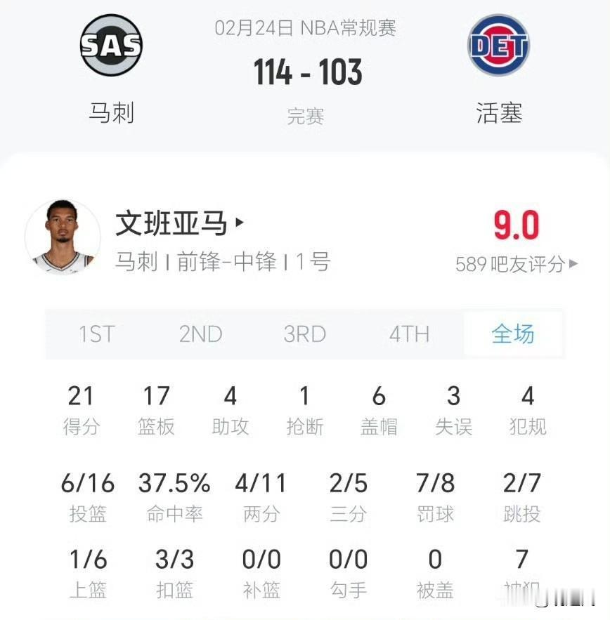 文班亚马攻防统治全场!马刺客场114-103力克活塞,豪取9连胜,同时终结对手5连胜。 马刺团队防守强硬、多点开花,全程压制对手节奏。从天赋新星到球队绝对核心。 文班亚马以场均两双+盖帽的统治表现,带领青年军一路高歌猛进,9连胜气势如虹,稳居西部前列,成为本赛季联盟最具竞争力的年轻球队之一。马刺 马刺队 马刺队门班亚马