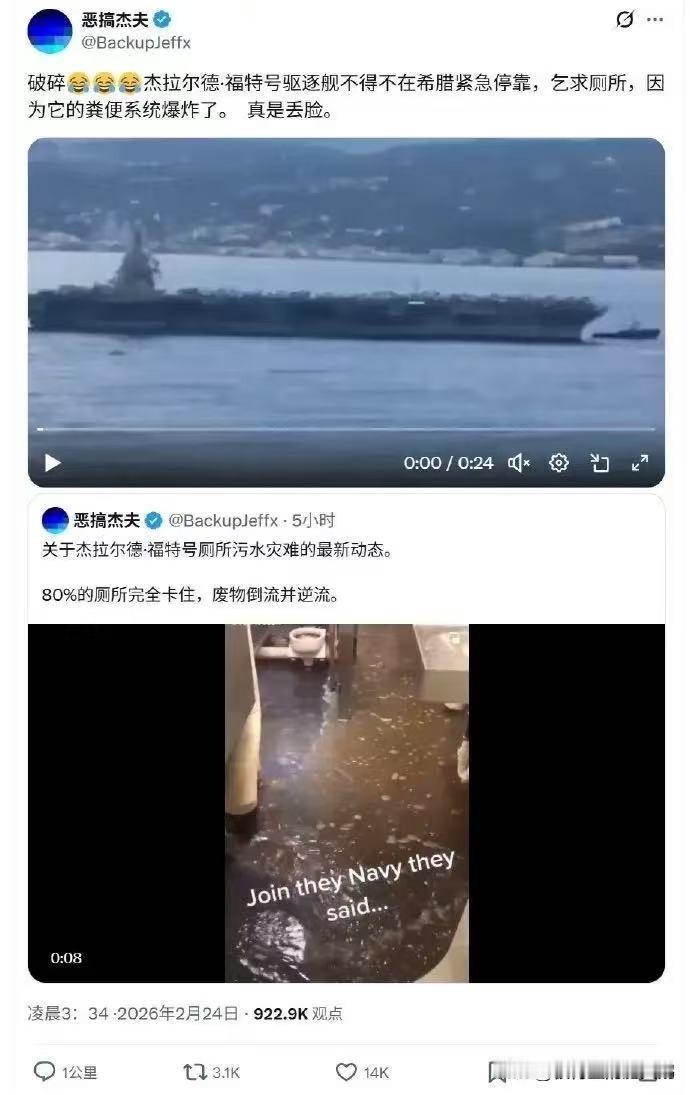 好家伙,一船的屎尿横流,这画面不敢想象,不忍直视。 破碎杰拉尔德·福特号航母不得不在希腊紧急停靠,乞求厕所,因为它的粪便系统爆炸了。 关于杰拉尔德·福特号厕所污水灾难的最新动态:80%的厕所完全卡住,废物倒流并逆流。