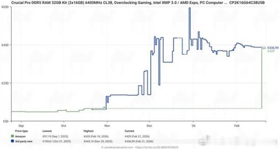 DDR5内存居然开始降价了内存价格已经暴涨小半年,预计还会持续很长一段时间,但在欧洲,部分DDR5内存已出现降价迹象。有网友持续追踪欧洲32GBDDR5内存套装价格,发现其价格走势较为特殊。去年9月及之前,价格一直保持稳定,约为95-100欧元(约合776-817元人民币),之后价格一路飙涨,至上个月已高达430-470欧元(约合3512-3839元人民币)。不过最近,该规格内存价格开始下探,降至370-420欧元(约合3022-3431元人民币)左右。此外,Tom's Hardware跟踪了欧洲亚马逊上五款32GBDDR5-6000/6400内存的价格走势,发现其中两款出现价格回落。其中,海盗船内存从2月初的480欧元(约合3921元人民币)降至425美元(约合2936元人民币),金士顿内存则从1月初的550欧元(约合4492元人民币)降至463欧元(约合3772元人民币)。不过需要注意的是,此次降价仅为部分产品的趋势,受不同国家、销售渠道、税率等因素影响较大;同时,这只是价格从峰值稍有回落,并不意味着整个内存行业降温。国内市场情况与之类似,大部分DDR5内存价格依然居高不下,甚至还在上涨,但也有部分产品价格稍有回落。