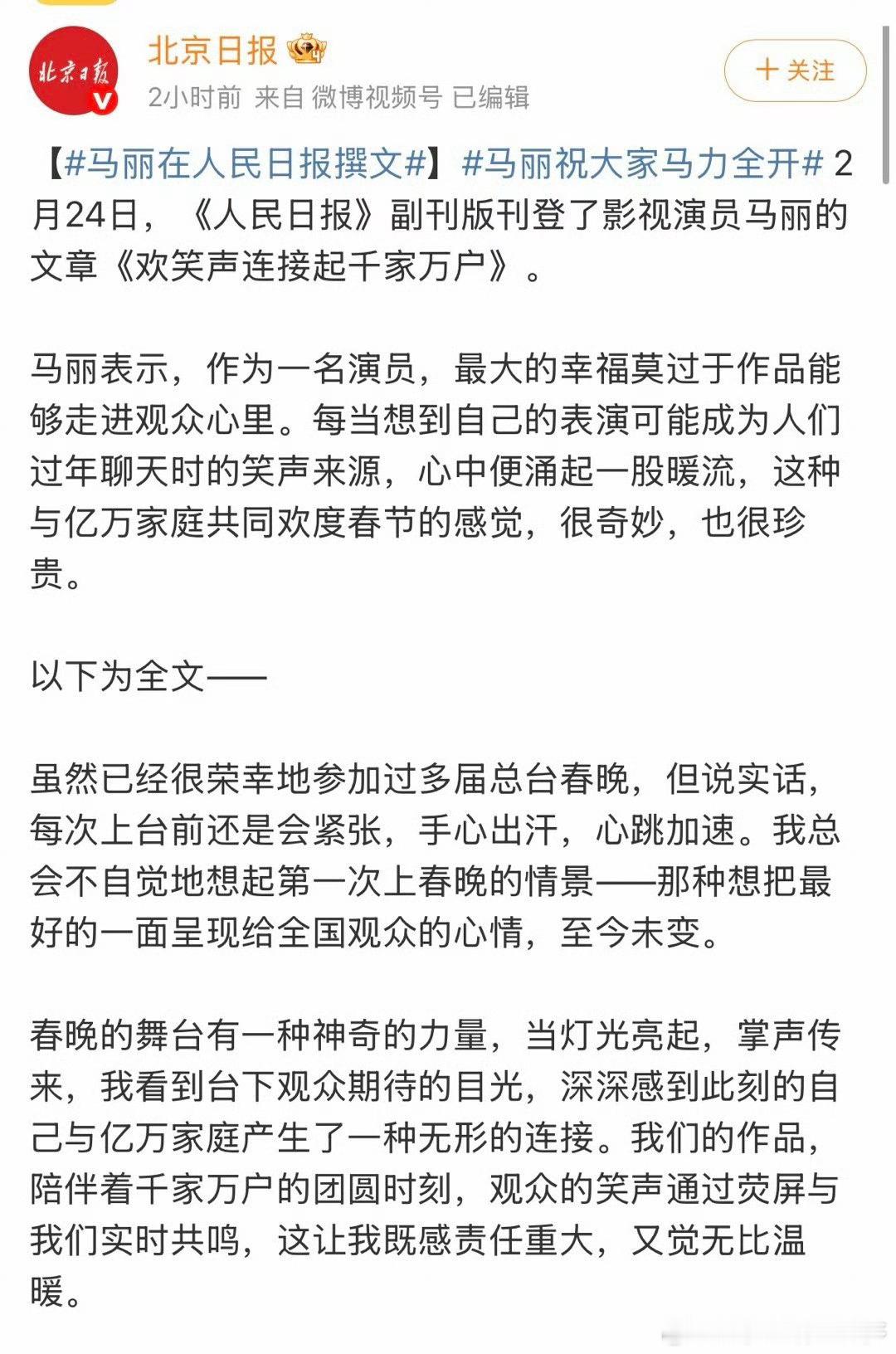 马丽在人民日报撰文马丽祝大家马力全开 马丽登人民日报谈初心,从春晚到春节档,作品从欢笑到思考,始终与观众心连心,开工祝大家马力全开,温暖前行~