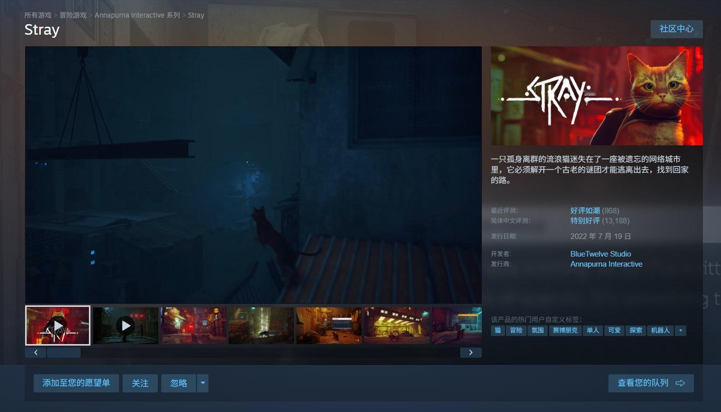 猫咪冒险游戏《STRAY》Steam平台新史低,折后58.8元(原价98元),3月8日截止,支持中文,目前国区好评率为94%特别好评。一只孤身离群的流浪猫迷失在了一座被遗忘的网络城市里,它必须解开一个古老的谜团才能逃离出去,找到回家的路。