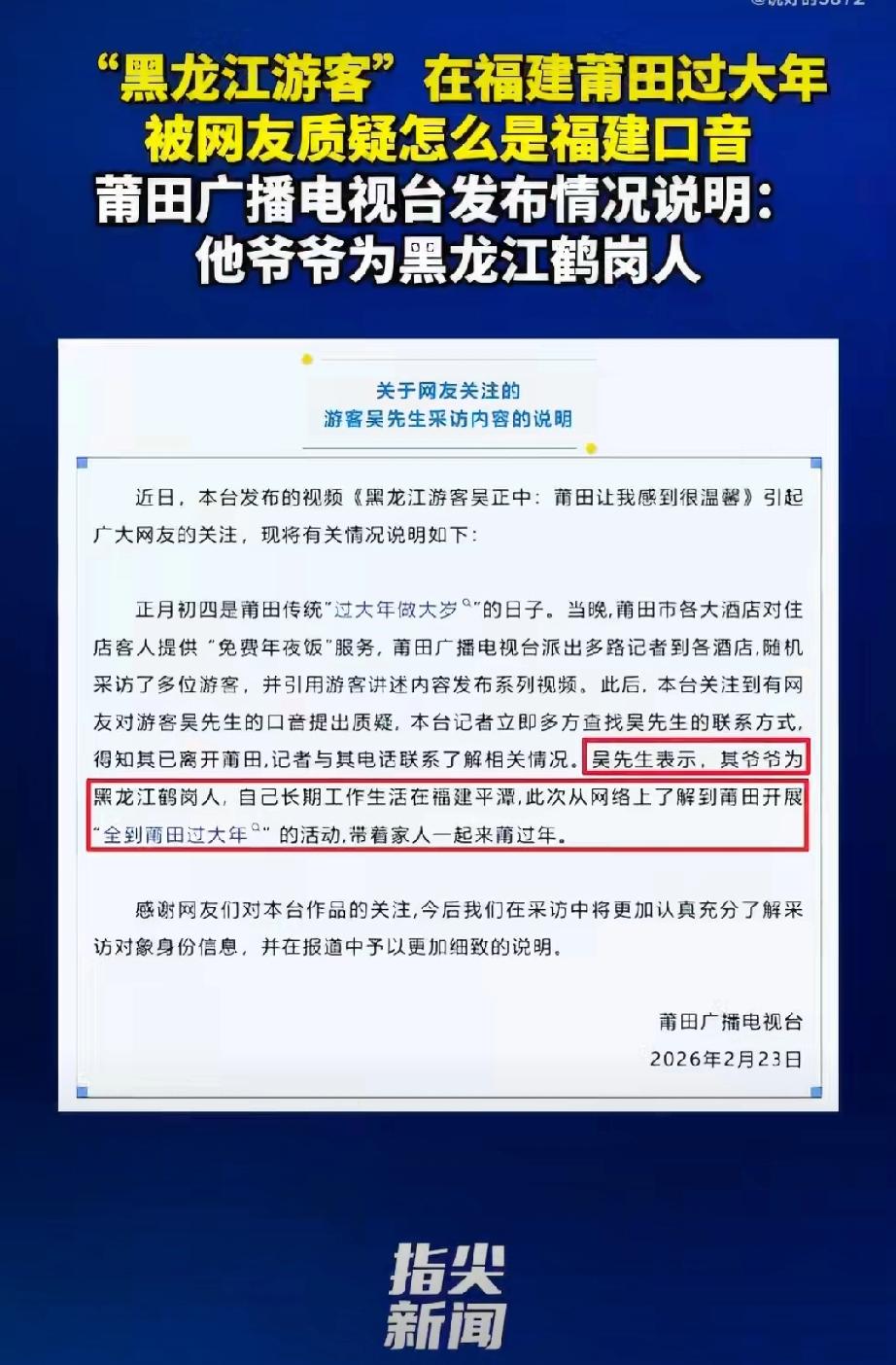 这不是实锤了吗?网友果然不好骗了。电视台回应黑龙江游客福建口音:查证他爷爷是黑龙江鹤岗人,他自己长期在在福建生活。还千里迢迢坐飞机11个小时赶到莆田,这剧本是他自己写的还是你电视台搞的?[笑哭]福建人在黑龙江 冒充黑龙江人 漳州江西人