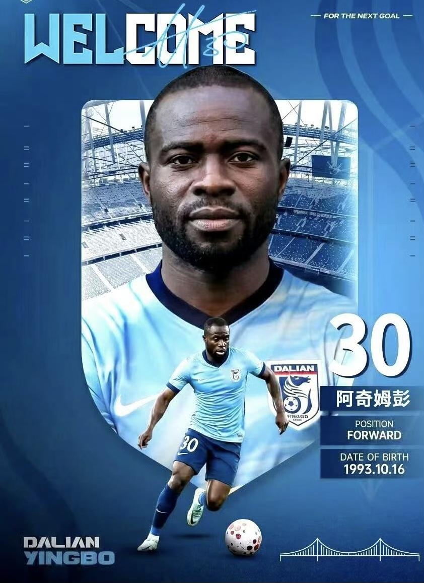 32岁的加纳边锋阿奇姆彭自由加盟大连英博。他生涯起步于加纳本土联赛费萨尔国王队。2011年加盟泰国武里南联,效力2个赛季,帮助球队夺得1次泰国联赛杯冠军和泰国杯冠军。2013年1月被租借至比甲安德莱赫特,在7月正式加盟,4年内获得2次比甲联赛冠军和比利时超级杯冠军。从2017年7月开始,阿奇姆彭正式来到中国足坛: 2017年:12场4球(天津泰达) 2018年:26场17球1助攻(天津泰达) 2019年:30场9球9助攻(天津泰达) 2020年:18场4球2助攻(天津泰达) 2021年:22场5球1助攻(深圳) 2022年:24场8球1助攻(深圳) 2023年:14场5球2助攻(深圳) 2024年:24场3球2助攻(河南) 2025年:30场14球3助攻(河南) 2026年:加盟大连英博
