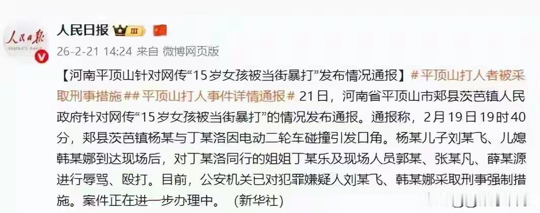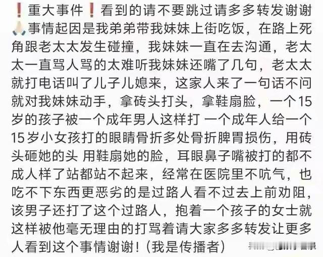 这个完整视频我看了,男子拎着一块儿砖头在女孩后面,然后用腿将女孩绊倒,女孩跌坐在地上,男子用砖头打了女孩7下,每下都打在女孩的头上和脸上,这就是故意伤害。 一个小小的碰刮,本来没有多大事,始作俑者是打人者的母亲,却一个电话摇来了气势汹汹的儿子儿媳妇儿,还带来了一个帮凶,他们要行凶的是一个只有15岁的女孩。 儿子用砖头打女孩的头部、面部,儿媳妇不仅不拉着,还用脚去踹女孩的身体,妈妈则坐在一旁冷眼观看,多么险恶的一家人。 现在女孩还在医院,面部、头部还有肋骨脏器多处损伤,全民愤慨,人民日报也对此事做了通报,全网拭目以待。 图自网络侵必删