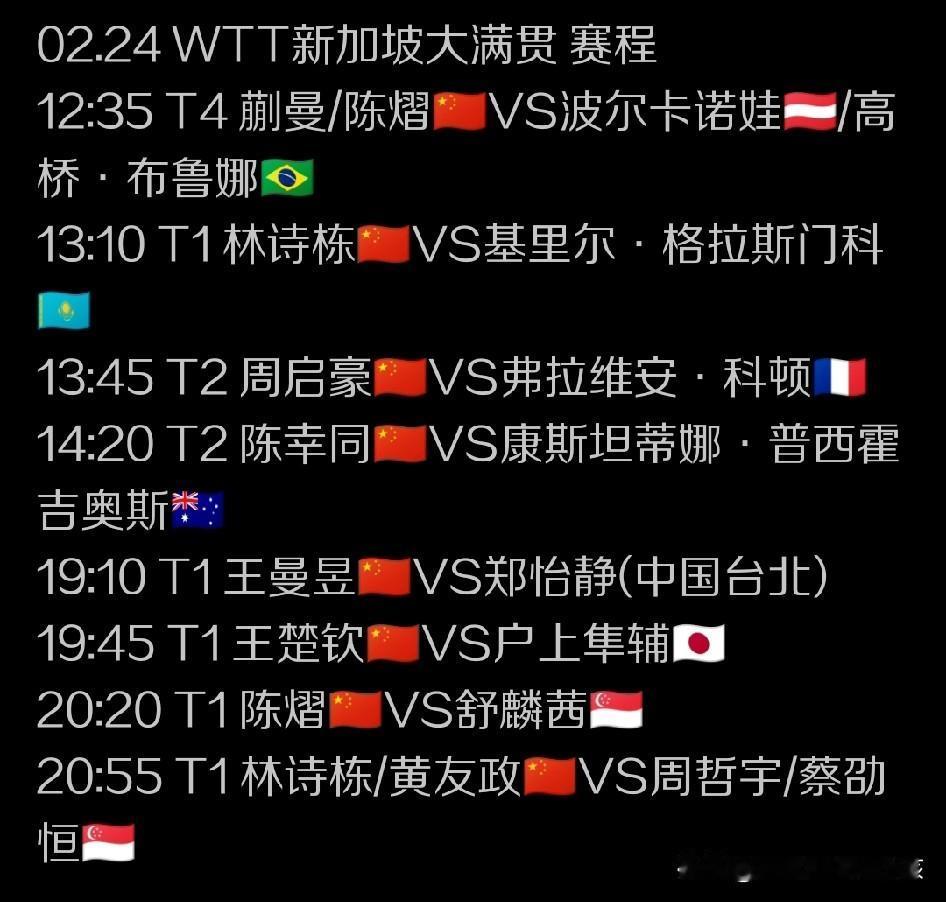 新加坡大满贯赛的赛场上2月24日的赛程当中,中国乒乓球队可以说是从双打开启这一天的赛程,也在双打比拼当中结束这一天的赛程,其中最早登场的蒯曼和陈熠这对女双组合是和波尔卡诺娃还有高桥布鲁娜的跨国搭档率先进行交锋。而接下来林诗栋则将接受吉里尔格拉斯门科的挑战,自然林诗栋晋级压力不算太大。 另外,下午时段还有周启豪迎战科顿,陈幸同和普西霍基奥斯之间的正面交锋。同样是国乒球员能力更为突出,不过周启豪的比拼压力不小。 晚间黄金时段,王曼昱则将接受来自中国台北的郑怡静的挑战,王楚钦是要和来自日本的3号主力户上隼辅进行正面对决。陈熠则将和新加坡的本土球员舒琳茜迎来正面对决。最晚的一场比赛是一场男双对决,林诗栋和黄友政的搭档也将和来自新加坡的本土组合周哲宇蔡邵恒之间正面交锋。 显然对于中国乒乓球队来说,这个比赛日当中的比拼里面,周启豪和科顿的交锋,还有王楚钦和户上隼辅的较量,最为吸引球迷的关注目光。前面一场比赛可以说是胜负悬念比较大,而另一场比赛则是中日男队当中关键球员之间的正面比拼。即使户上隼辅前面还有张本智和以及上升势头迅猛的松岛辉空,但户上隼辅也是日本男乒的一个重点球员。在比赛当中经常也有一些超水平发挥,需要我们对这两场比赛给予充分关注。也相信国乒球员能给我们带来更多惊喜!也希望大家一起看球评球!